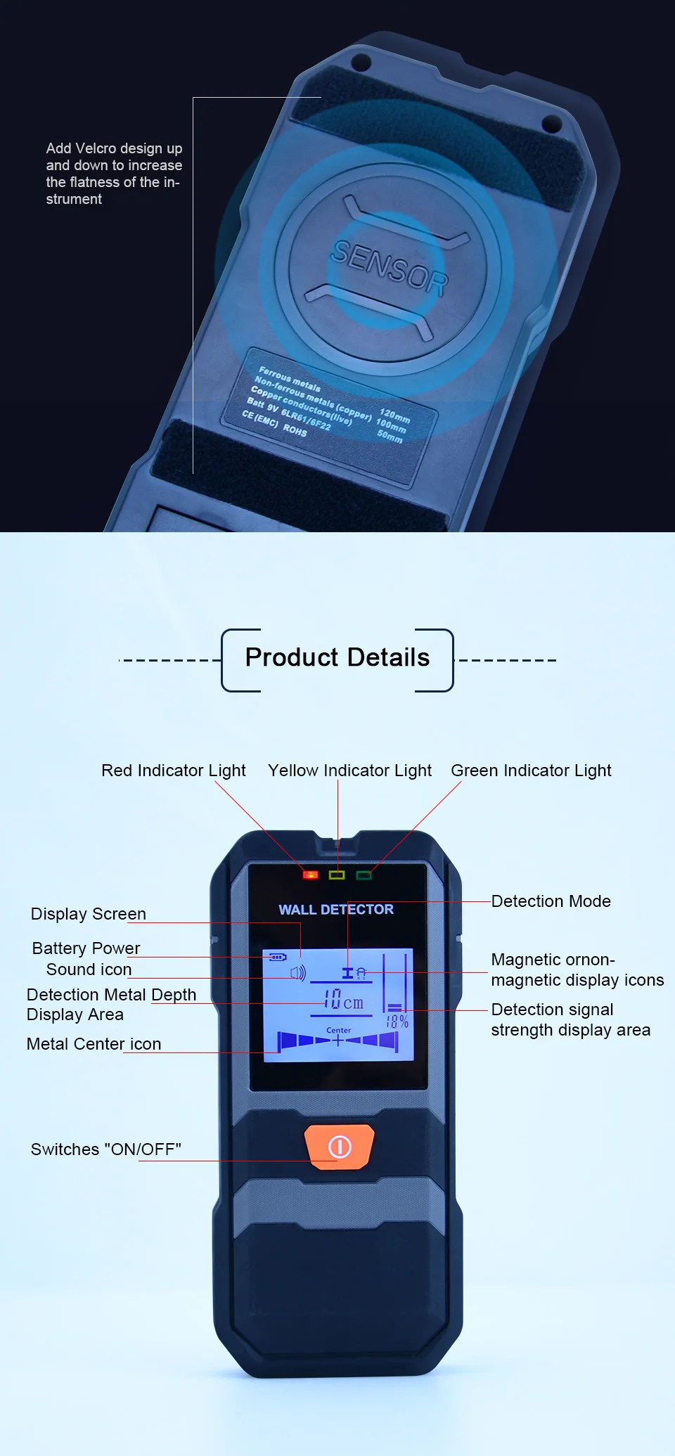 Особенности:Детектор может обнаруживать металлы (стальные стержни, медные трубы и т. Д.) и кабели, скрытые в стенах, потолках и полах. Экран с подсветкой, интуитивно понятный дисплей, точное обнаружение. Мягкая резина против падения, простая в эксплуатации. Облегчает обнаружение, безопаснее и экономит время. Датчик большой площади Улучшает точность. Одна кнопка, открыть и проверить, решить проблему нескольких кнопок режима. На экране отображаются данные о расстоянии обнаруженного объекта, а гудящий звук указывает на расположение объекта.