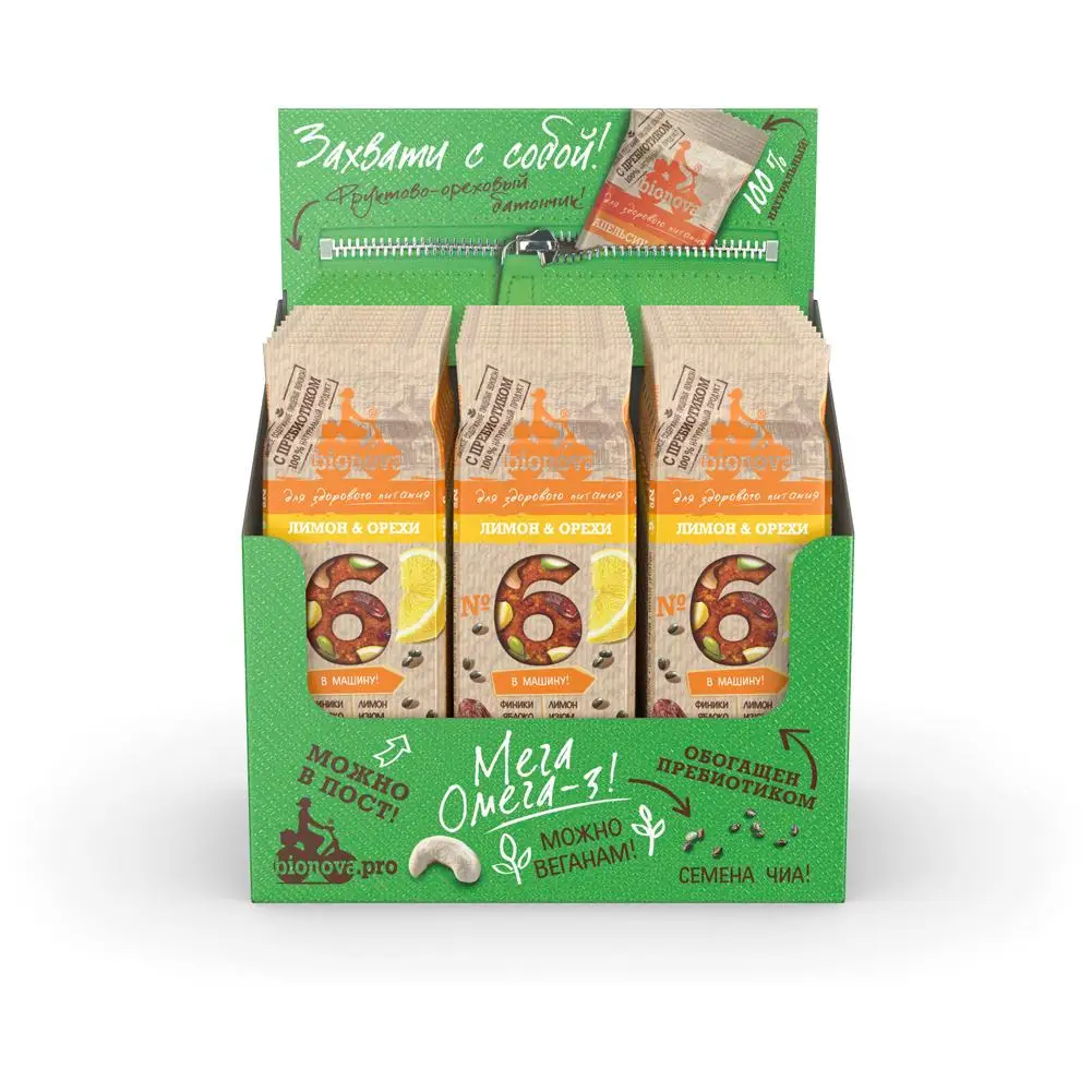 Состав: финики сушеные, изюм, яблоки сушеные, пищевое волокно из цикория – инулин, кешью, цедра лимона сушеная, семена тыквы, семена Чиа