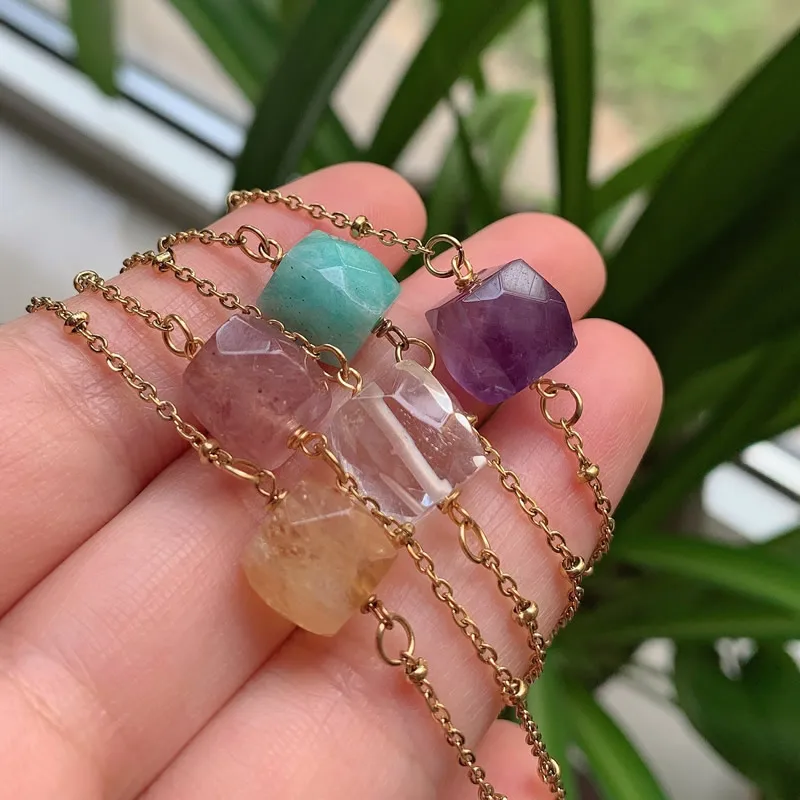 Healing Jewelry Natural Crystal Necklace Stainless Steel Choker Multifaceted Quartz Citrines Amazonite Amethysts Crystal Collier