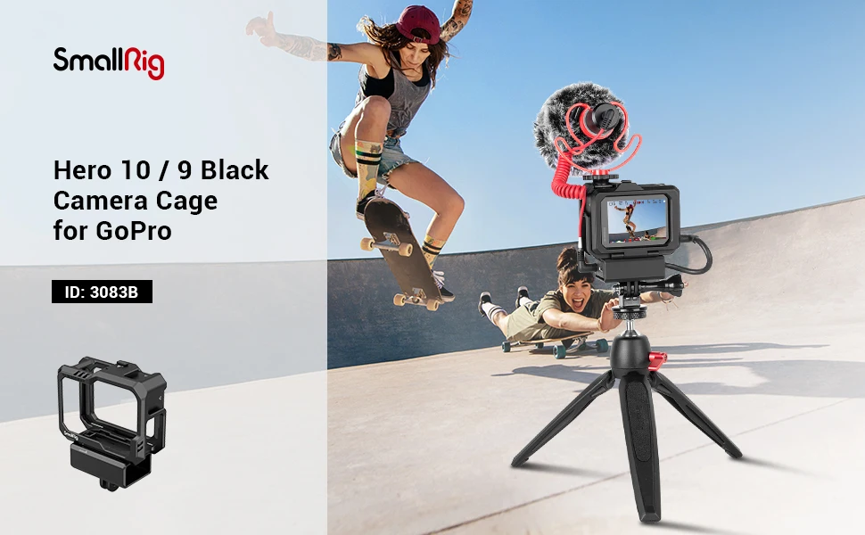 Черная клетка для камеры SmallRig GoPro Hero10/9 3083Полная Клетка. Он поставляется с двумя креплениями для холодной обуви, совместимыми с микрофонами, светодиодный подсветкой, что обеспечивает идеальное решение для съемки Vlog. Складное Нижнее крепление поддерживает оригинальный адаптер GoPro mic. Прикрепленная боковая панель может заменить оригинальную боковую пластину камеры, чтобы включить запись звука во время зарядки. Клетка так хорошо подходит для камеры, что не блокирует экран, кнопки, USB-C порт. Он может быть быстро заблокирован нажатием на крышку и выпущен нажатием кнопки, только вручную. Нижняя часть содержит крепление GoPro, совместимое с оригинальной Опорной пластиной GoPro.