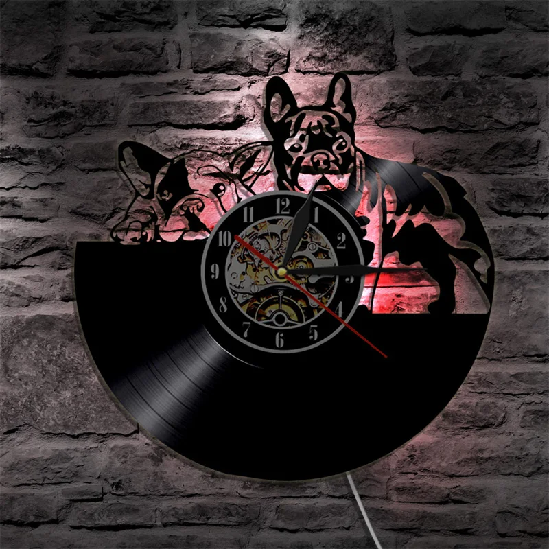 Настенные часы со светодиодный Ной подсветкой и виниловой пластинкой французского бульдога