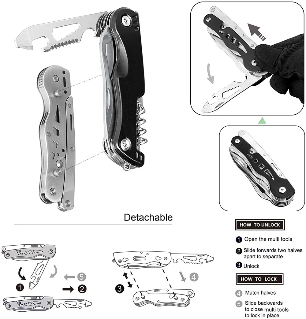 Основные инструменты: многофункциональные мини-инструменты, идеально подходят для самостоятельной работы и работы на открытом воздухе. Когда мультиинструмент вставляется в карман, вам больше не нужно переносить весь чехол для инструмента. Пиленое дерево, достаточно сильное, чтобы сломать стеклянную занавеску, отрезать веревку занавеску в опасном спасательном порту и т. д. Подходит для кемпинга, рыбалки, охоты, пеших прогулок или альпинизма, пожалуйста, подготовьте многоинструментальные лезвия для экстренного использования. Очень подходит для вашего автомобиля или дома, чтобы обеспечить вашу безопасность.