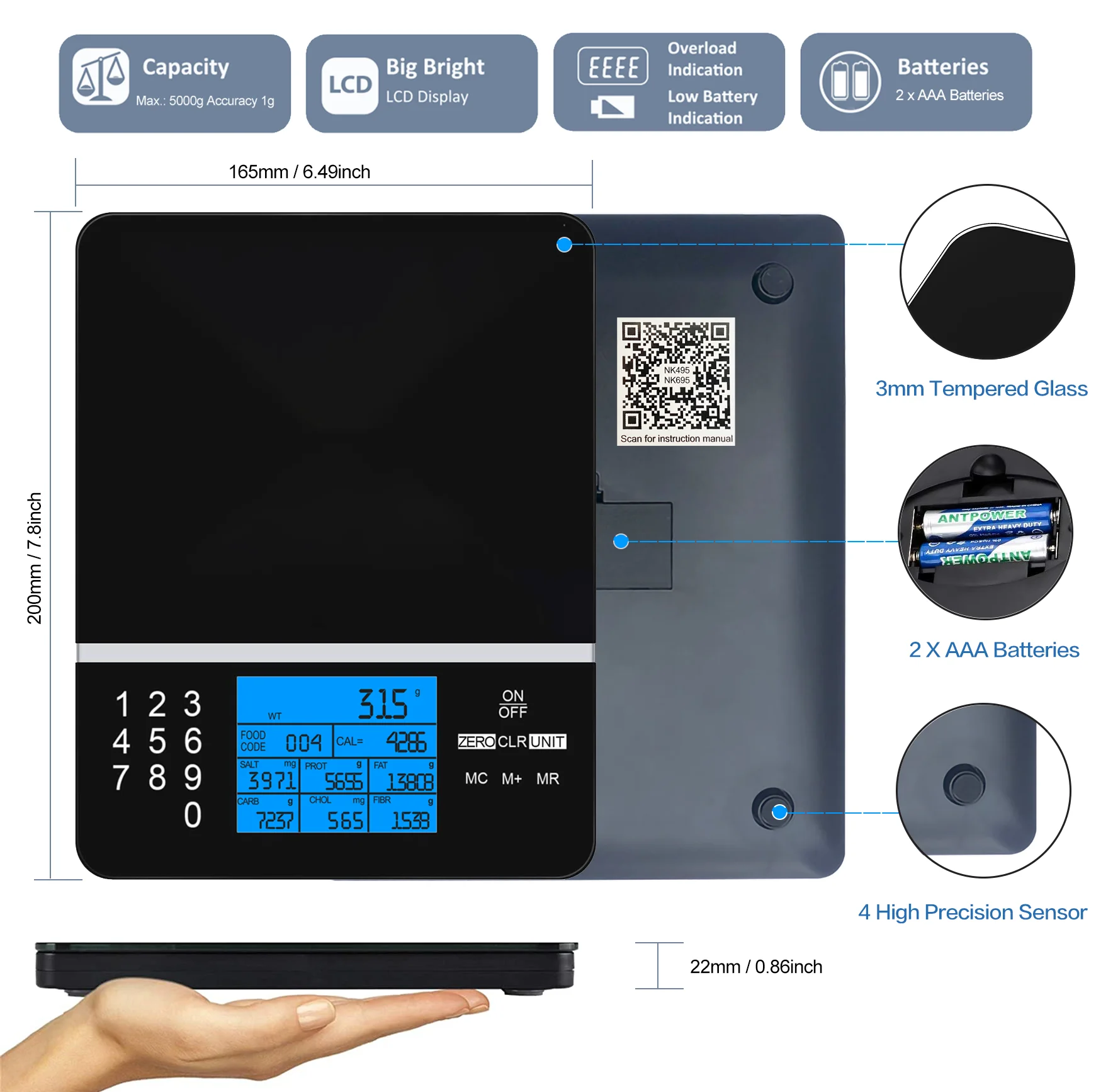 Точные измерения размытия: Ataller пищевая шкала имеет 4 высокоточных датчика, которые измеряют вес внутри. 1 унций/1 г точность; Как только вес был точно измерен, вы можете посмотреть пищевой код среди 999 пищевых продуктов в прилагаемом руководстве, Введите код в шкалу и получите точные данные о 7 нутриональном содержании вашей еды.