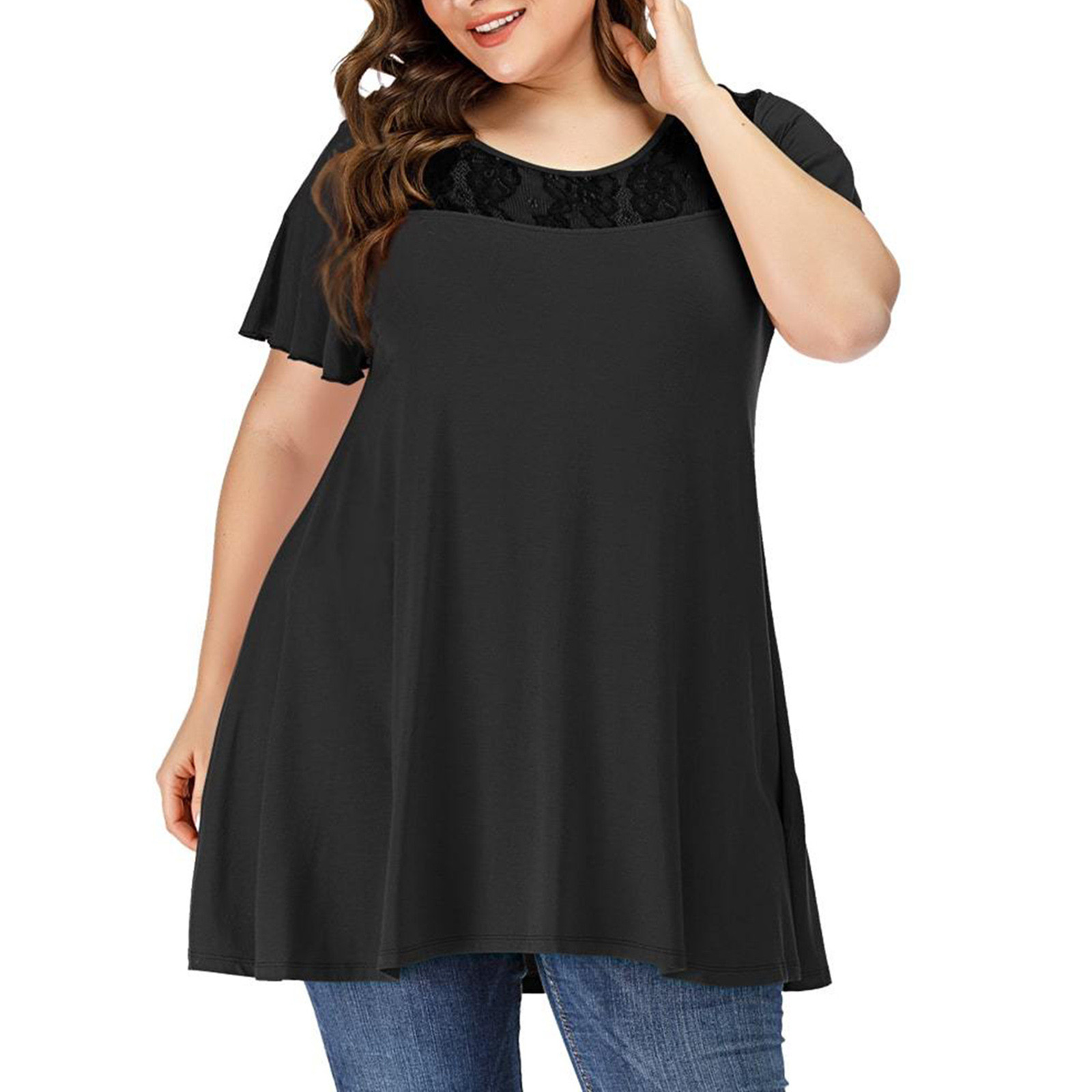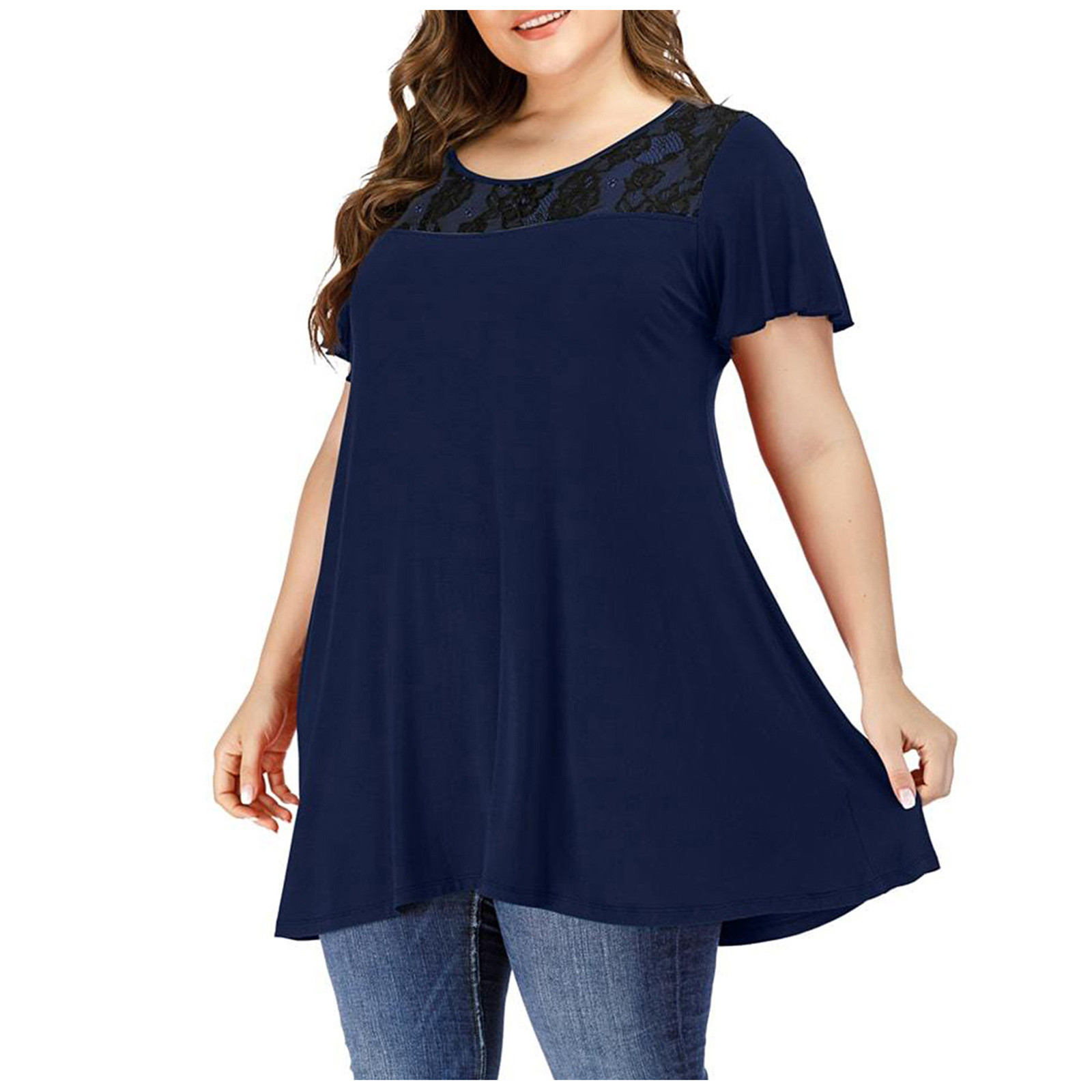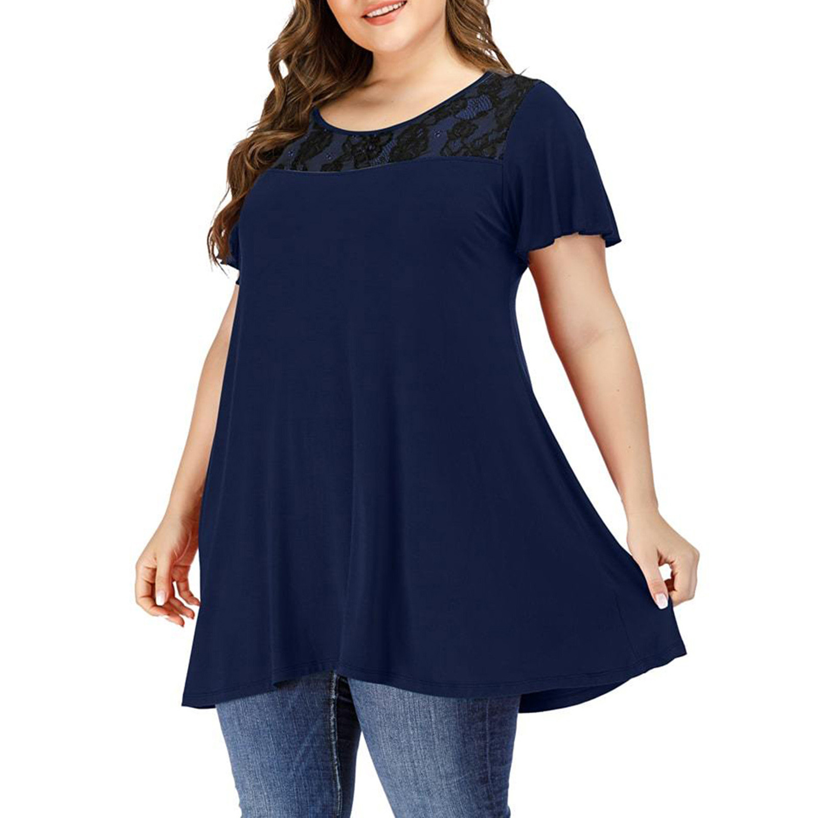 Женские повседневные свободные мягкие кружевные топы с коротким рукавом и круглым вырезом больших размеров