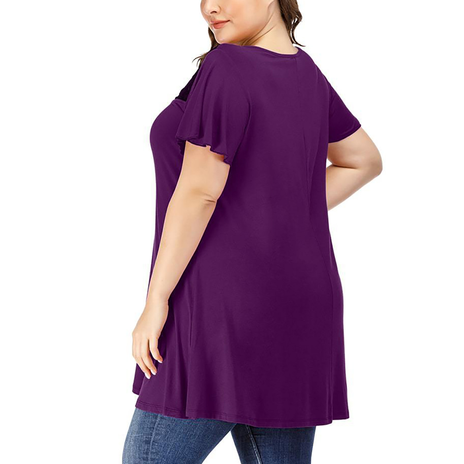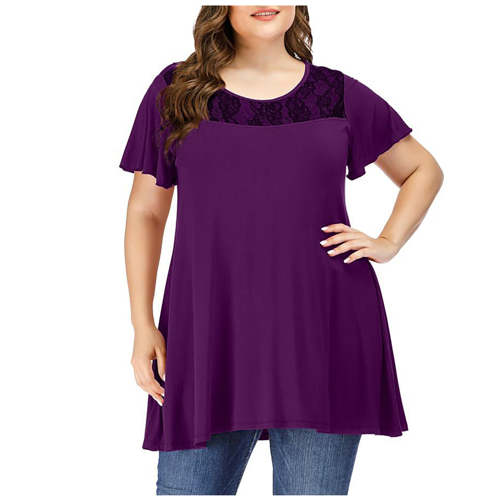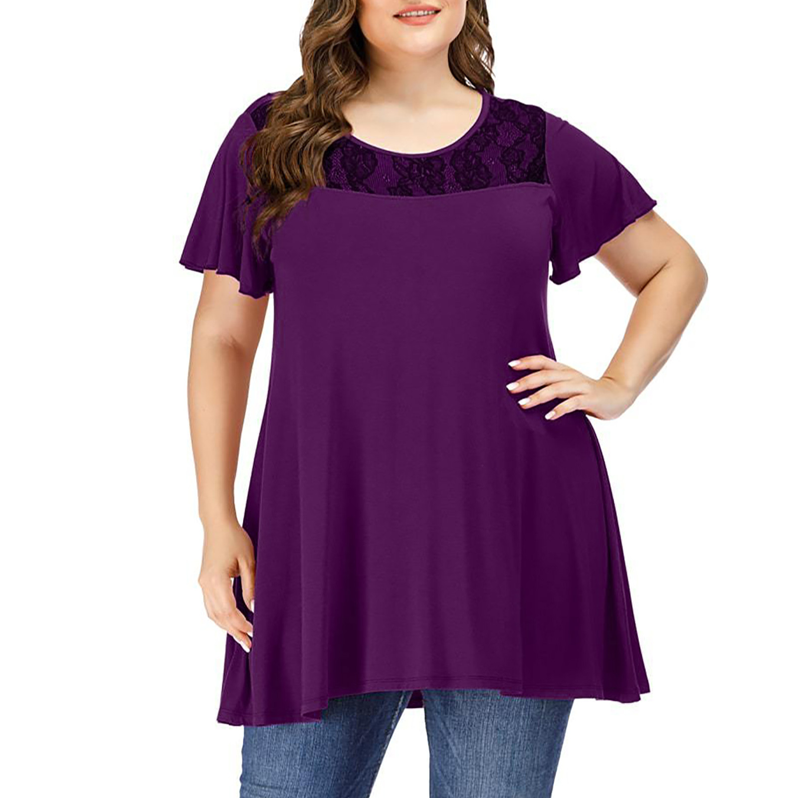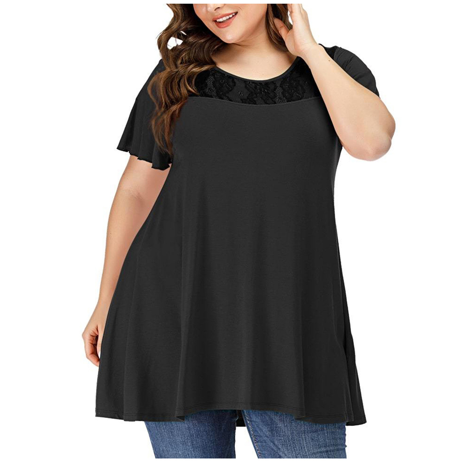 Женские повседневные свободные мягкие кружевные топы с коротким рукавом и круглым вырезом больших размеров