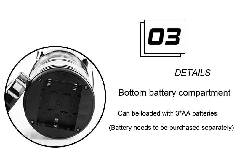 Model: 917 Battery: 3 * AA batteries(Without battery) Light source: LED white light Material: ABS + stainless steel Size: 8.5*18cm Weight: 233g