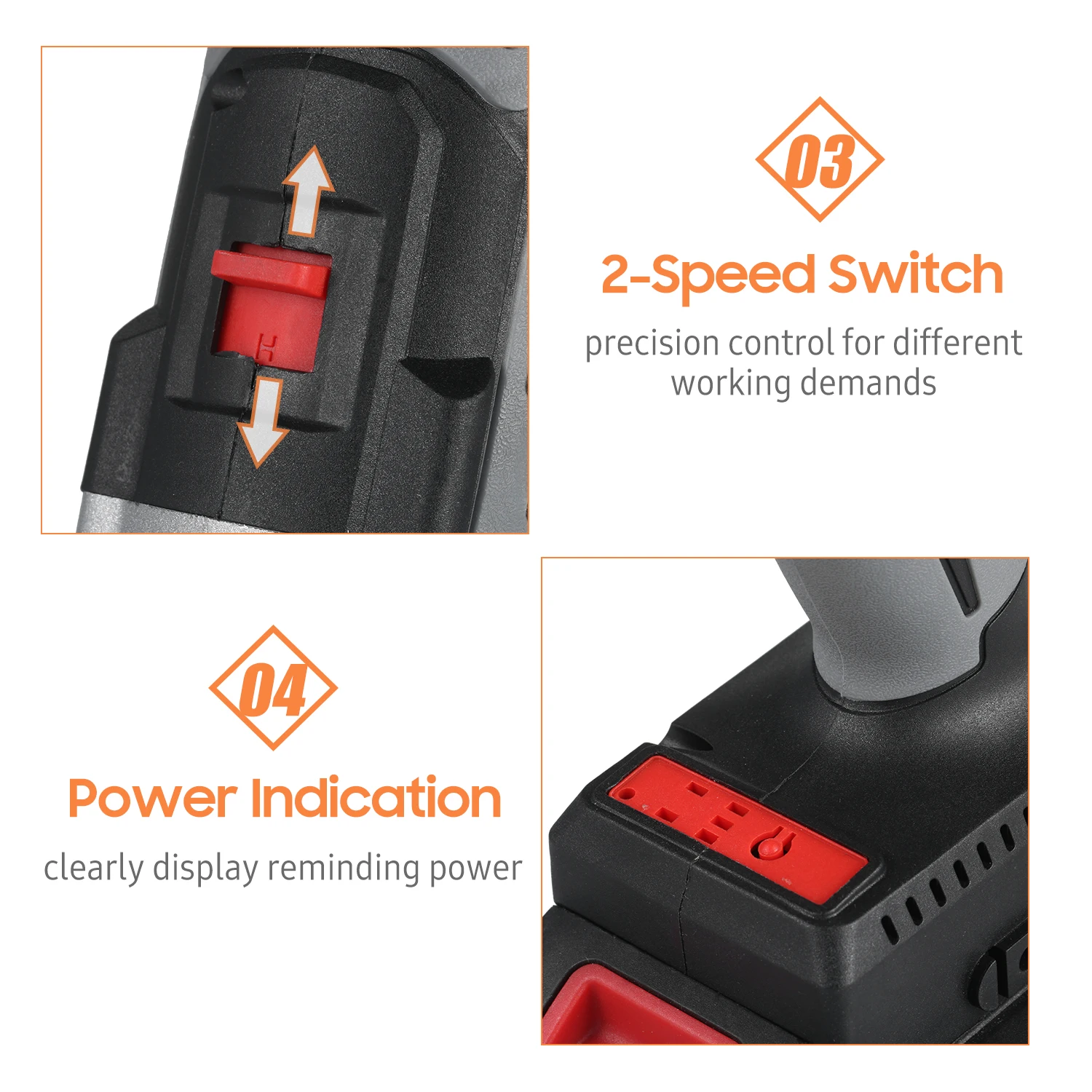 1/2in цельнометаллический БЕСКЛЮЧЕВОЙ патрон и светодиодный рабочий светильник-по сравнению с 3/8in пластиковым патроном, 1/2 дюйма Автоматическая блокировка бесключевого металлического зажимного патрона является более стабильной и не отпадает и обеспечивает максимальную совместимость и долговечность аксессуаров. Светодиодный светильник, активированный триггером, для увеличения видимости в закрытых рабочих помещениях и в темной среде.