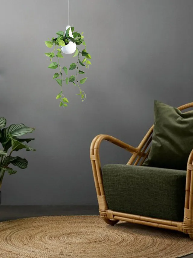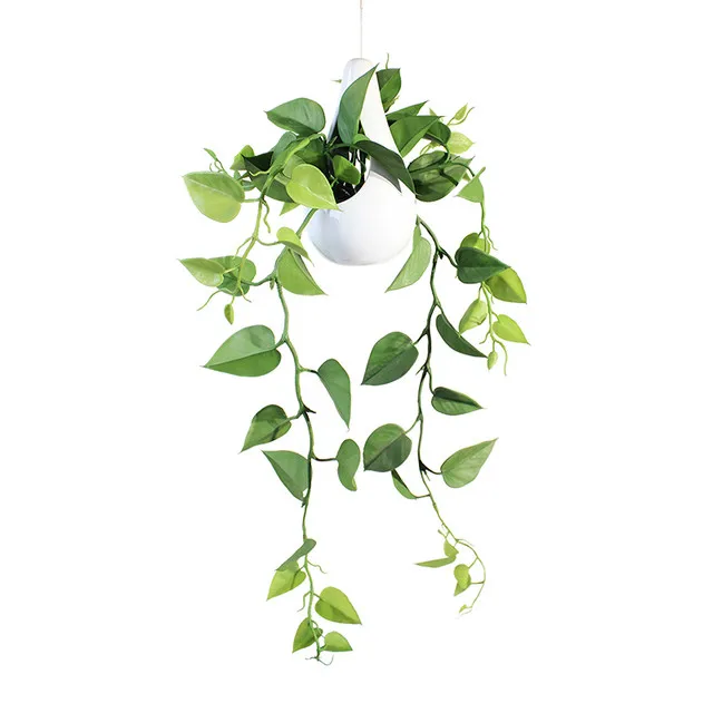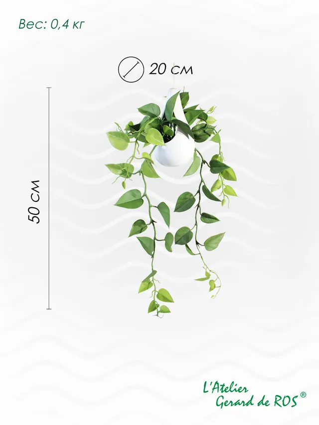Искусственное растение имеет мясистый стебель стреловидные глянцевые листья и воздушные корни. Листья разнообразны по своему размеру и окрасу: верхние имеют более темный оттенок. Еще большее очарование искусственному филодендрону добавляет дизайнерское подвесное керамическое кашпо в форме капли, входящее в комплект.