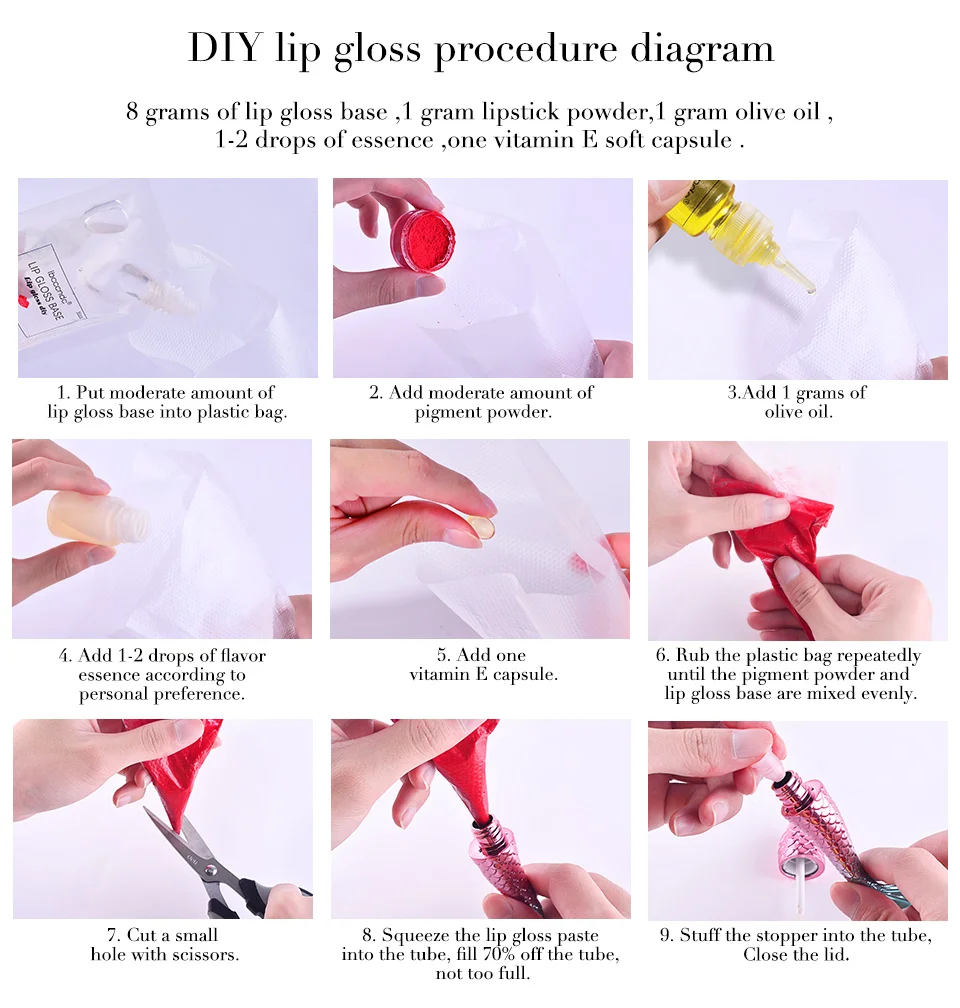 Если вы покупаете комплект, вы получите все необходимые материалы. Сделайте свой собственный блеск для губ, безопасным и значимым. Также у нас есть дополнительный блеск для губ, пигмент и аромат для вас.