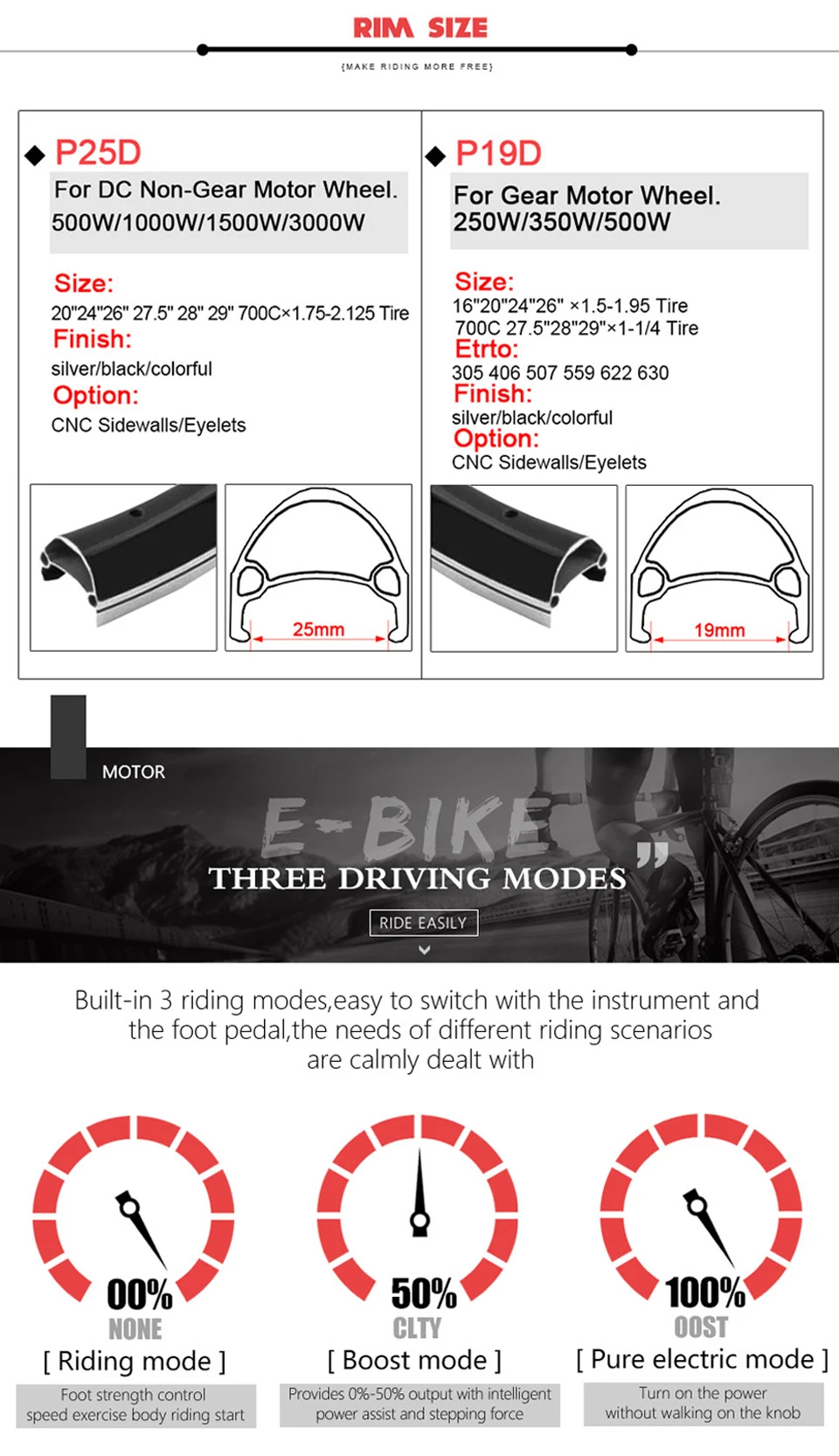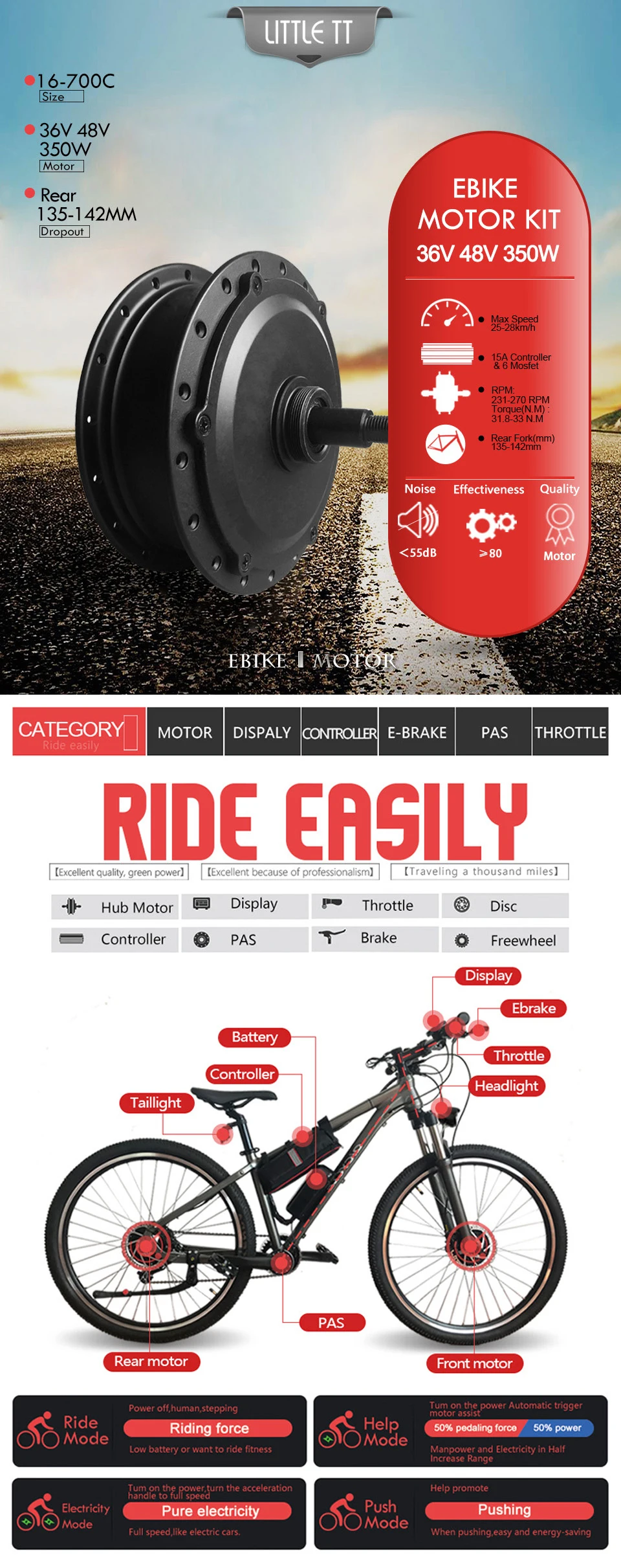 ▶ Конверсионный комплект Не подходит для колес, включает аккумуляторы, Колеса свободного хода, шины, дисковые тормоза и усилитель крутящего момента. (Если вам нужны батареи, свободные колеса, шины, дисковые тормоза, усилитель крутящего момента, пожалуйста, свяжитесь с нами для дополнительных затрат) Если вы выбираете «только колеса», есть только один электрический двигатель, без других аксессуаров; ▶ Если вам нужно свободное колесо, дисковый тормоз, усилитель крутящего момента, есть ссылка, чтобы компенсировать разницу в нижней части страницы деталей, или, пожалуйста, свяжитесь с нами; ▶ PAS, дроссельная заслонка и E-brake в комплекте являются дополнительными. Если вам нужно заменить его, пожалуйста, посмотрите ссылку, чтобы компенсировать разницу в нижней части страницы деталей, или, пожалуйста, свяжитесь с нами. ▶ Пожалуйста, обратитесь к форме списка упаковочных продуктов. 【Особенности продукта 】 Этот продукт может легко превратить ваш обычный велосипед в электрический велосипед. Это на сотни долларов дешевле, чем покупка нового электрического велосипеда. Для успешного преобразования требуется 1-2 часа. Мы поставим руководство по установке в коробку. И мы предоставим Вам коробку контроллера в подарок! 【Упаковочный лист 】 ① 350 Вт заднее колесо x1 (без шины) ② Контроллер 15A x1 ③ Дисплей и руководство x1 ④ Дроссельная заслонка x1 ⑤ Выключатели питания тормозные рычаги x1 ⑥ Датчик PAS x1 ⑦ Световой индикатор Застежка-молния и защитная линия x1 ⑧ Удлинитель двигателя x1 ⑨ Подарок! Блок контроллера x1 【 Набор для преобразования электровелосипеда Двигатель: ◆ Номинальное напряжение: 36V 48V ◆ Номинальная мощность: 350 Вт ◆ Номинальная скорость: Около 25-28 км/ч ◆ Об/мин: 231-270 об/мин ◆ Крутящий момент (Н. М): 31,8-33 Н. М ◆ Задняя вилка (мм): 135-142 мм ◆ Тип тормоза: Дисковый тормоз ◆ Тип: Бесщеточный мотор-редуктор ◆ Место установки: Заднее колесо ◆ Подпорка С двухстенным ободом из алюминиевого сплава с 36 люверсами, спицами из нержавеющей стали ◆ Нагрузка ≤ 200 кг ◆ Длина кабеля двигателя: 200 мм ◆ Размер колеса: 16 дюймов 20 дюймов 24 дюйма 26 дюймов 27,5 дюйма 28 дюймов 29 дюймов 700C колесаКонтроллер: