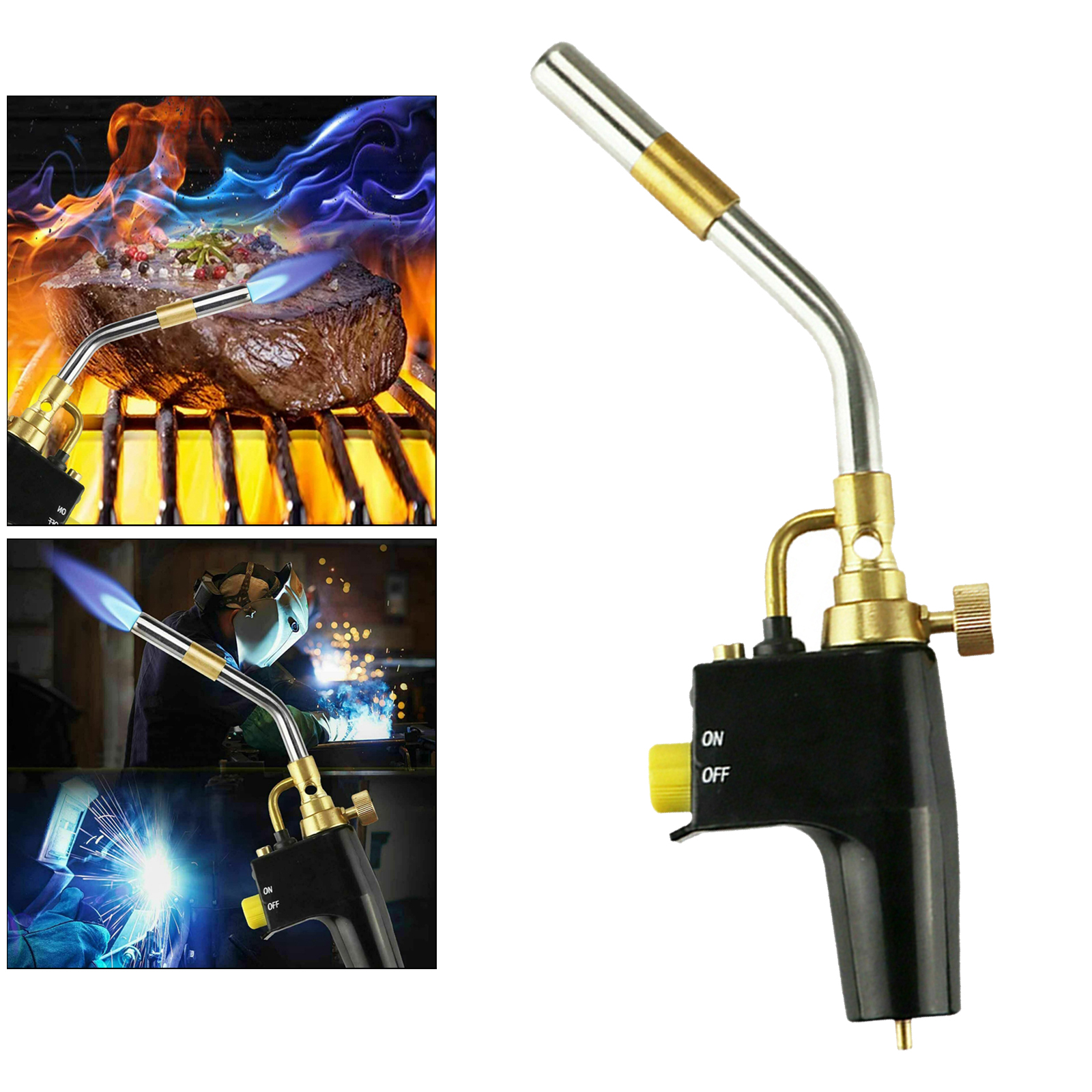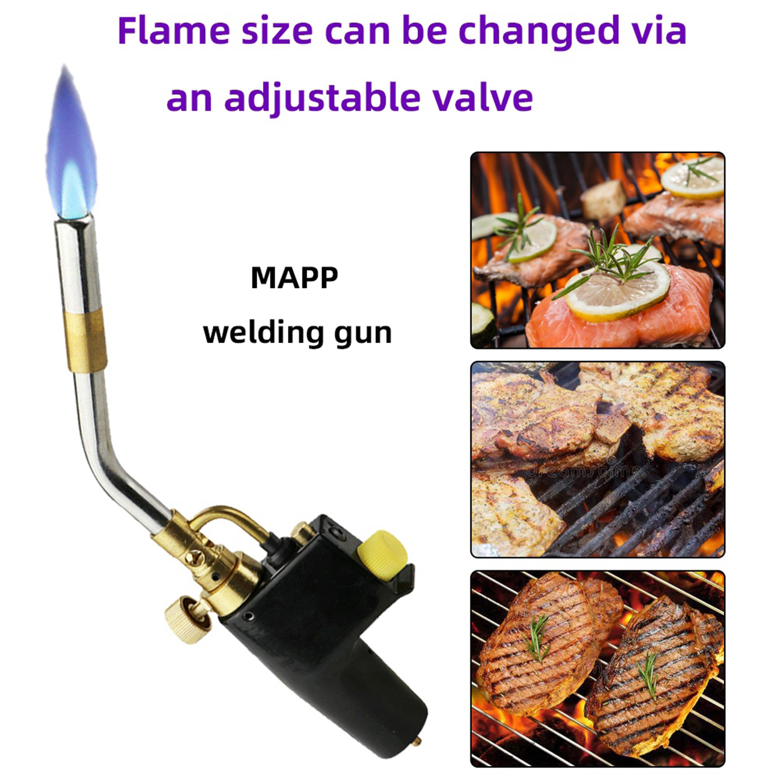 Размер пламени может быть изменен с помощью регулируемого клапана и оснащен защитным замком для предотвращения случайного зажигания. Эргономичная рукоятка обеспечивает удобство использования.
