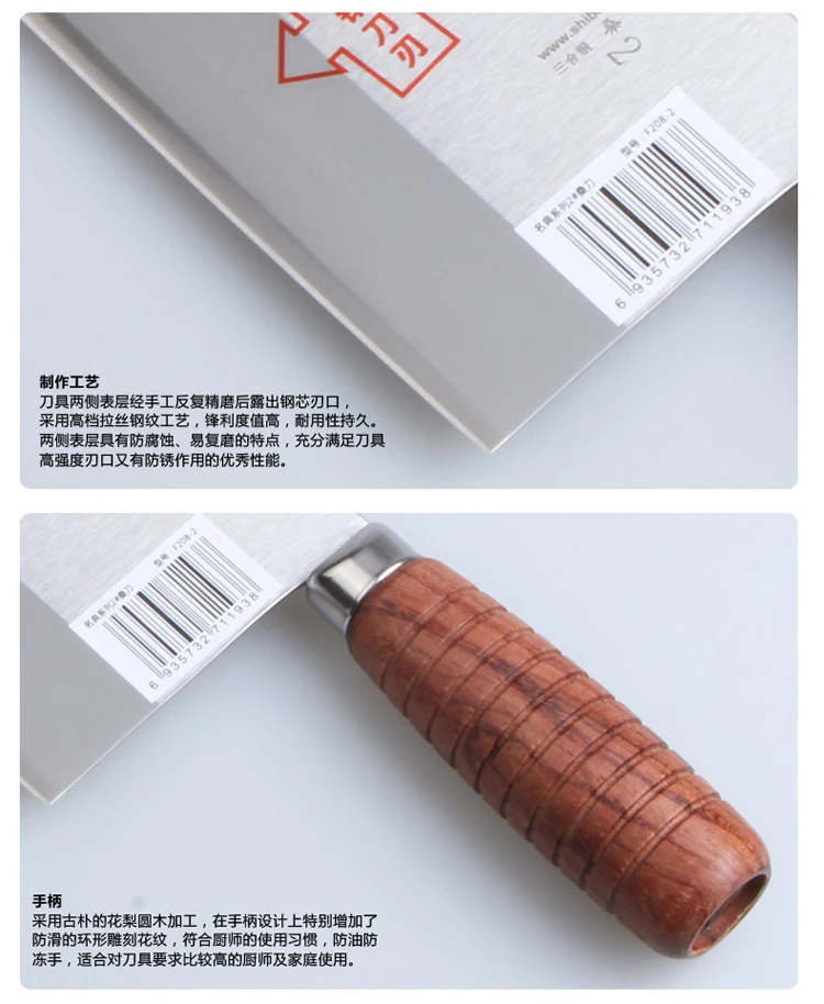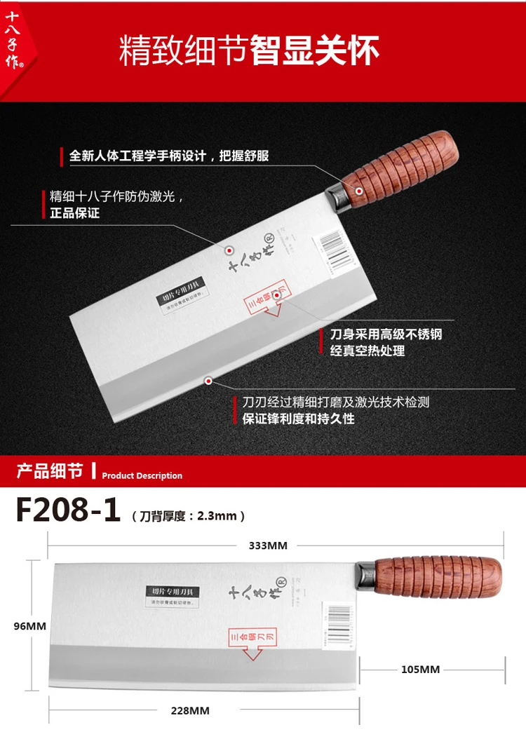 Материал лезвия: углеродистая сталь Материал: фанера Длина ножа: 312 мм Длина лезвия: 208 мм Ширина лезвия: 88 мм Толщина лезвия: 24 мм Твердость: 58-59HRC Вес: 306 г Упаковка: цветная коробка Использование: резка мяса, овощей, фруктов, рыбы и так далее. 1. Пожалуйста, держите его подальше от детей. 2. Пожалуйста, не держите край и точку ножа нацелены на людей. 3. Пожалуйста, не ловите нож вручную, когда нож опускается. 4. Пожалуйста, очистите и высушите нож после использования и поместите его в сухое место. 5. Лезвие очень остро, пожалуйста, не используйте палец, чтобы проверить остроту ножа. Здоровая охрана окружающей среды, безопасность и здоровье, износостойкая коррозионная стойкость, легко моется не в форме