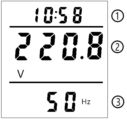 Страница 3: ① время работы ② Напряжение сети: текущее напряжение сети в реальном времени, в вольт; ③ частота сетки переменного тока, в герце.