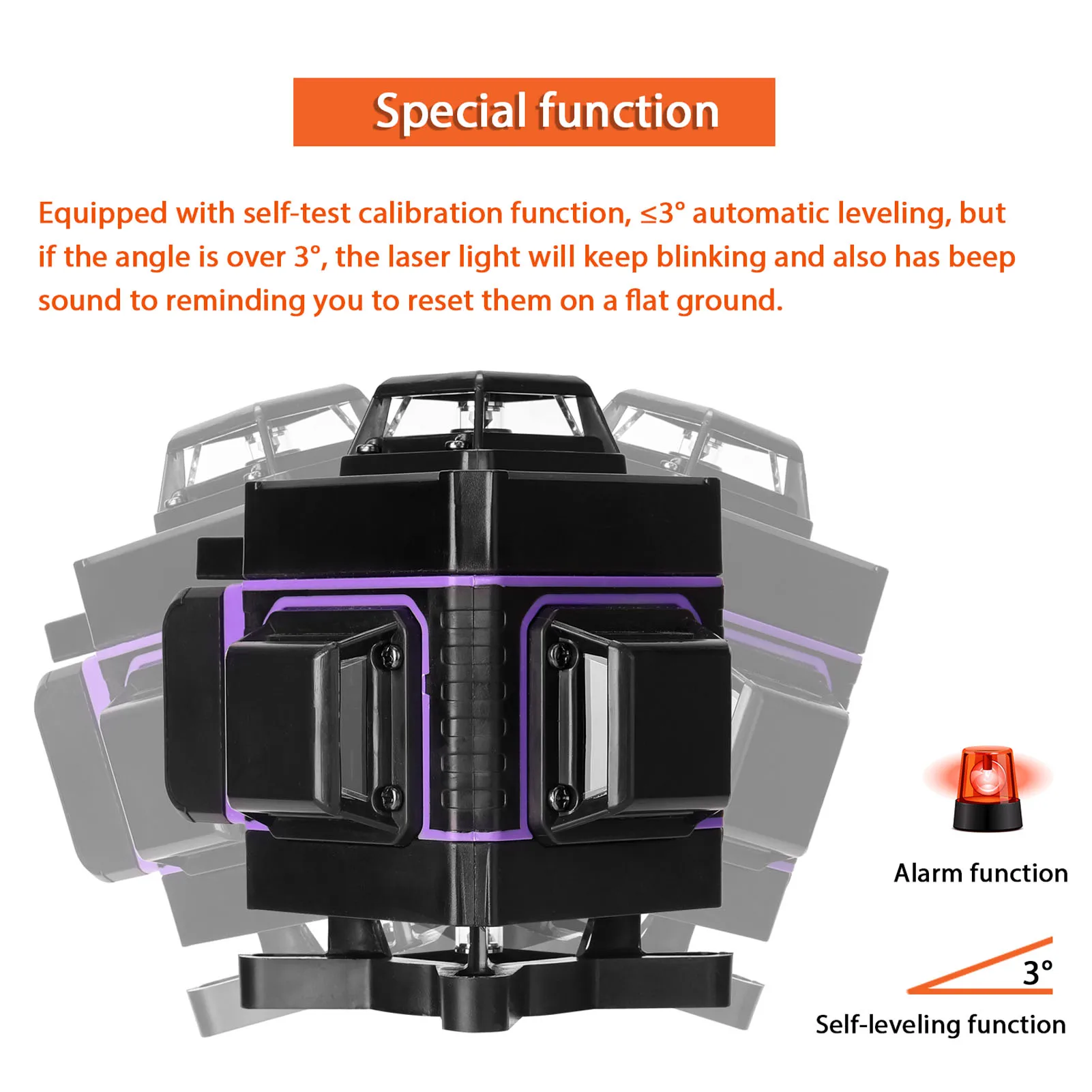Оснащен функцией самостоятельной калибровки, ≤ 3 ° автоматическое выравнивание, но если угол превышает 3 °, лазерный светильник будет продолжать мигать, а также имеет звуковой сигнал, чтобы напомнить вам, чтобы сбросить их на ровную поверхность.