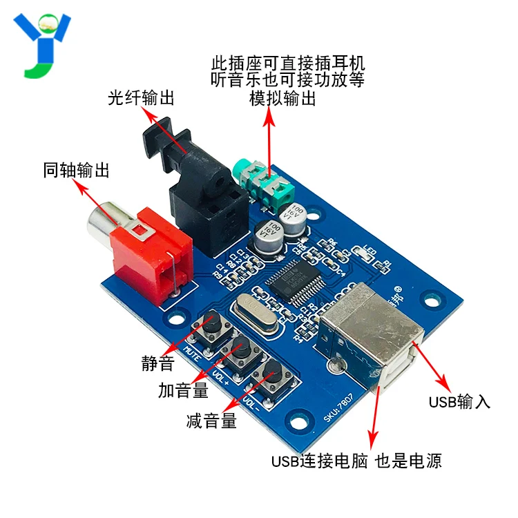 The main chip adoptsBBCompany'sHIFIlevelPCM2704 USB Decoder chip,Its performance is better than the most commonly used low-end chip in the marketCM102Sseries ,Power supplyUSBpower supply,The output can be directly connected to the headset,It can also be used as the front level.Digital output can be more advancedDAC Decoder supplySPDIFdigital signal,For better sound quality.Because it is an external sound card,Avoid serious electromagnetic interference in the case,Signal to noise ratio and sound quality are improved. PCM2704It's a monolithic DAC chip。It has two digital to analog conversion output channels and an integrated circuitUSBInterface controller。Interface complianceUSB1.1standard。PCM2704Can receive48KHz、44KHzand32KHzMeasurement of sampling rate16Bit stereo or mono audio data,Software volume and mute function are integrated in the chip,The volume and mute of the computer can be adjusted synchronously.