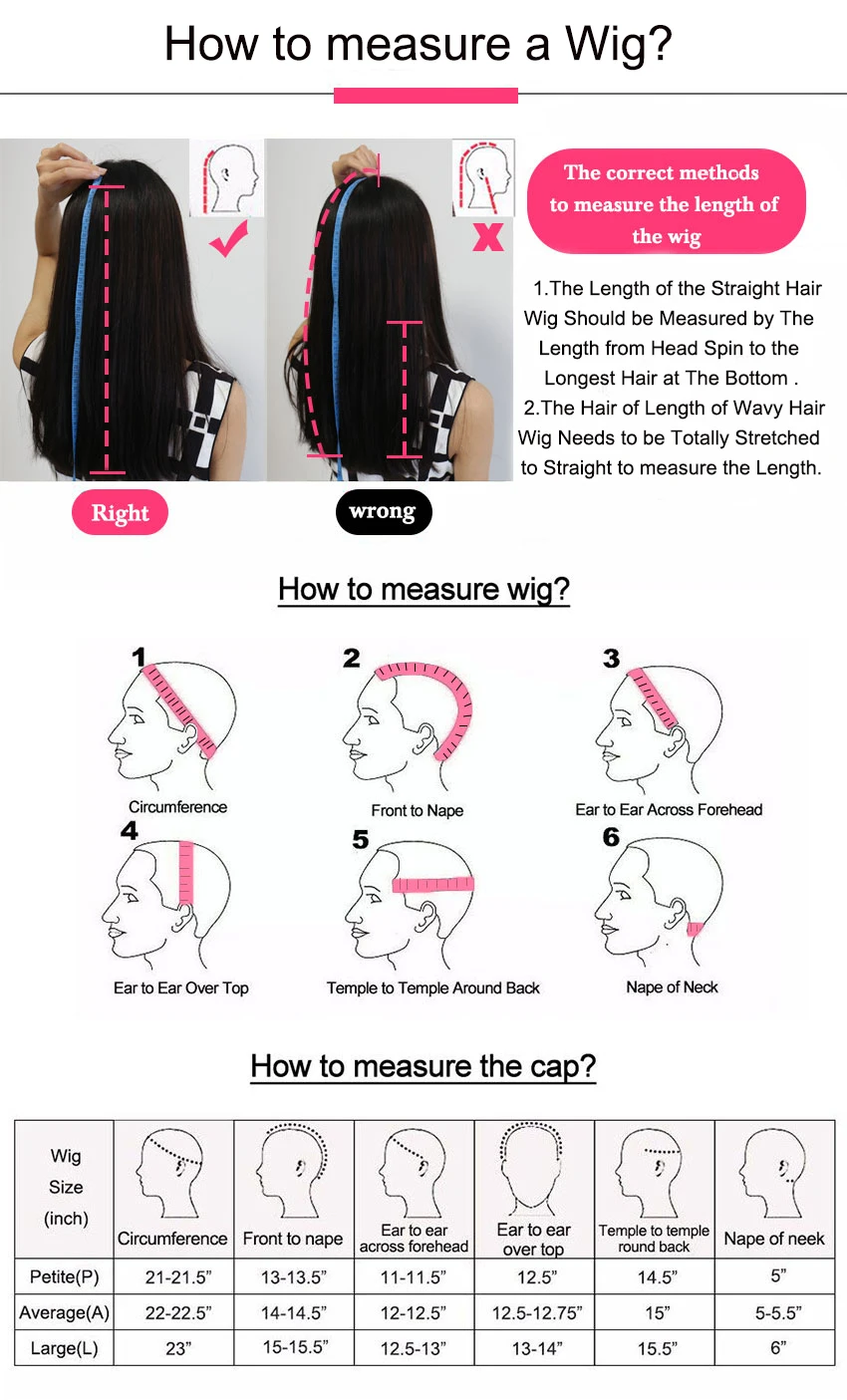 1. Длина прямого парика должна измеряться длиной от головы до самых длинных волос на дне