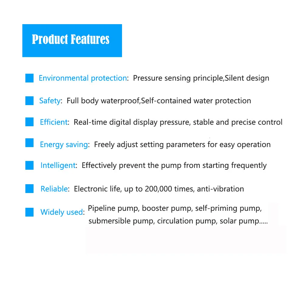 220V,10A; Насос с использованием геотермальной энергии (≤ 1.5KW)Может быть запущен непосредственноХарактеристики продукта:Экологичность: бесшумный дизайнБезопасность: IP65, водонепроницаемый чехол, защита от нехватки водыУмный: Предотвращение автоматического перезапуска насосаНадежный: электронный дизайн, с длительным сроком службы для использования, больше, чем 200000 раз Операционная, Антивибрационная конструкцияШирокое применение: Трубопроводный насос, Бустерный Насос, самовсасывающий насос, погружаемый насос, циркуляционный насос и т. Д. Широко используется для солнечного теплового насоса, теплового насоса с источником воздуха, домашнего бустерного насоса WILO, циркуляционного насоса для горячей воды Grundfos и других соответствующих насосов.Описание использования:Подача воды сверху внизКлапан сброса давленияПоложение устройстваВысотаСамый низкий выход водыВерхнее значение = Макс. Давление насоса-0,5 кгМеньшее значение = 0,5 кгЗащита нехватка воды значение = 0,2 кгВода снизу вверх:Самый высокий выход водыВерхнее значение = Макс. Давление насоса-0,5 кгМеньшее значение = H * 0,1 кг + 0,5 кгЗащита от нехватки воды ≤H * 0,1 кгНасос с автоматическим управлениемПоложение устройстваВысотаСамый высокий выход водыРасположение поверхности водыВерхнее значение = (максимальное давление насоса-ч) * 0,1 кг-0,5 кгМеньшее значение = H1 * 0,1 кг + 0,5 кгЗащита от нехватки воды ≤ H1 * 0,1 кгЗадний кодКодЗначениеКак использоватьH2.9Верхнее значение, остановка 2,9 кгВы можете установить его в качестве инструкцииL1.5С более низкой стоимостью, стоп-сигнал 1,5 кгВы можете установить его в качестве инструкцииF0.2Защита нехватка воды 0,2 кгВы можете установить его в качестве инструкцииE-FЗащита от нехватки водыНажмите ON/OFF для перезапуска или ожидания перезапуска автоматическиE-HОшибка, диапазон давления или датчик поврежденПроверьте источник давленияПроводкаПожалуйста, посмотрите на заднюю часть WPC-10 контроля давления, слева-китайское слово «мощность», вы можете поставить 220 В переменного тока, справа-китайское слово «Мотор», подключите его к терминалу питания насоса 220Vac.