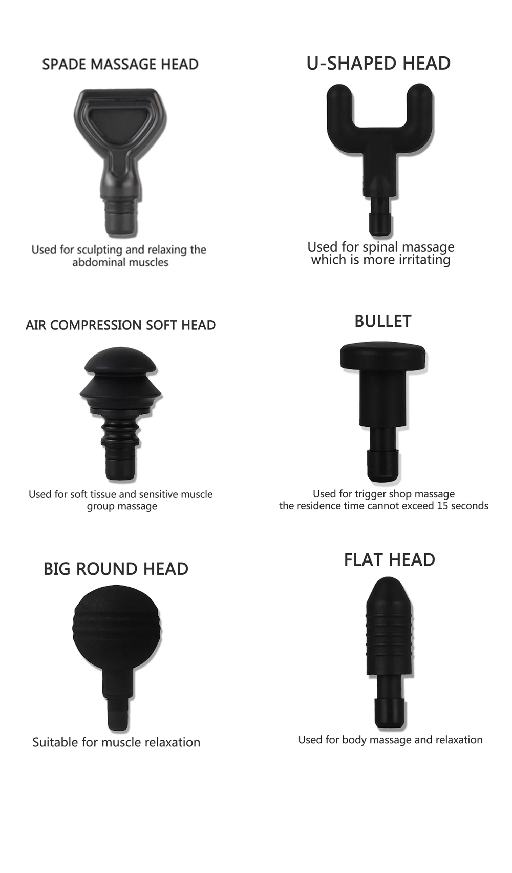 1 * массажный пистолет 4 * Массажная головка 1 * сумка EVA 1 * зарядное устройство (ЕС/США/Великобритания/Австралия) 1 * Руководство пользователя