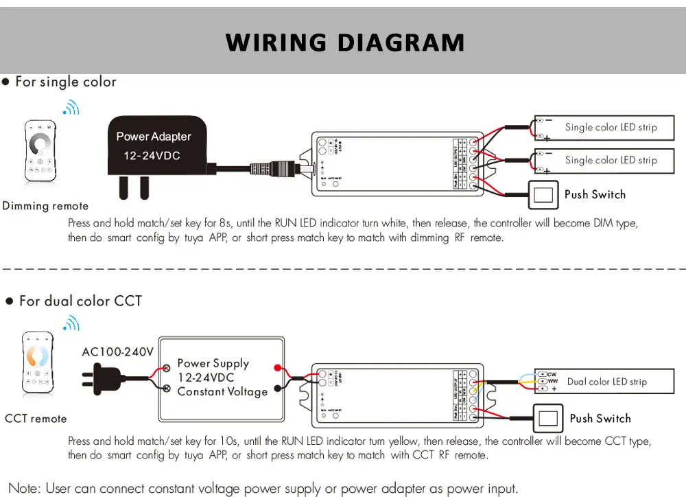 ● Пользователя необходимо установить светильник типа регулятор нажатия кнопки перед приложение Tuya сетевое подключение и матч RF пульт дистанционного управления одной и той же светильник типа.