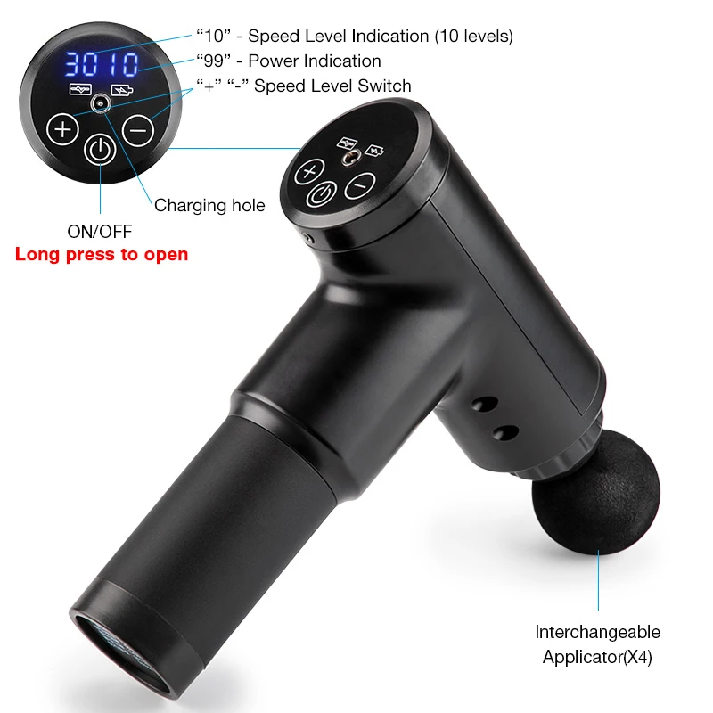 Легиральный глубокий тканевый массажный пистолет имеет очень простой в эксплуатации светодиодный контроль, вы можете легко регулировать скорость и уровень вибрации.