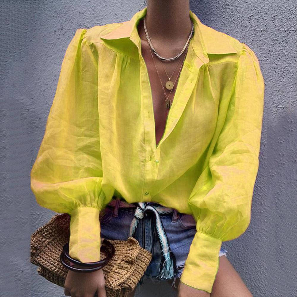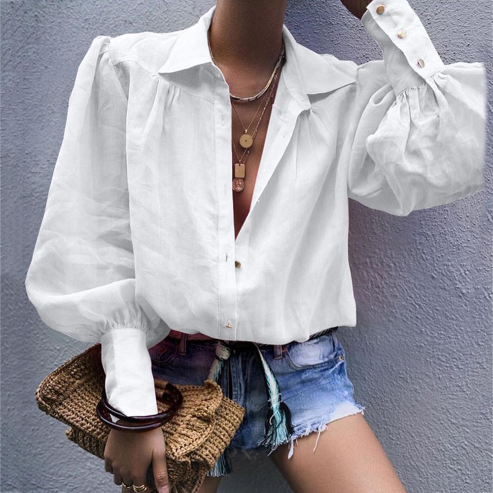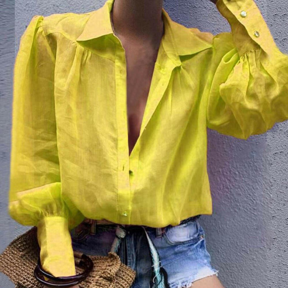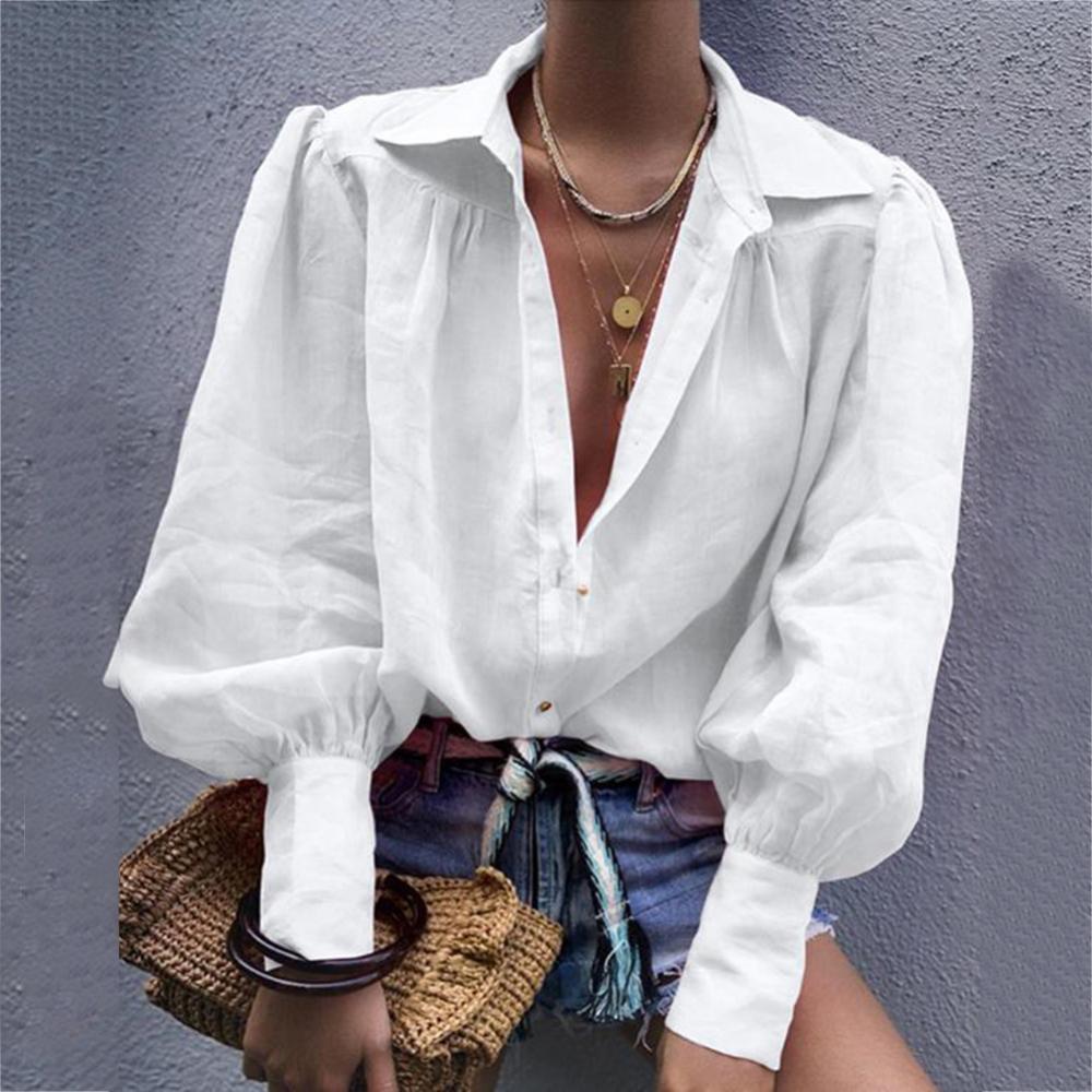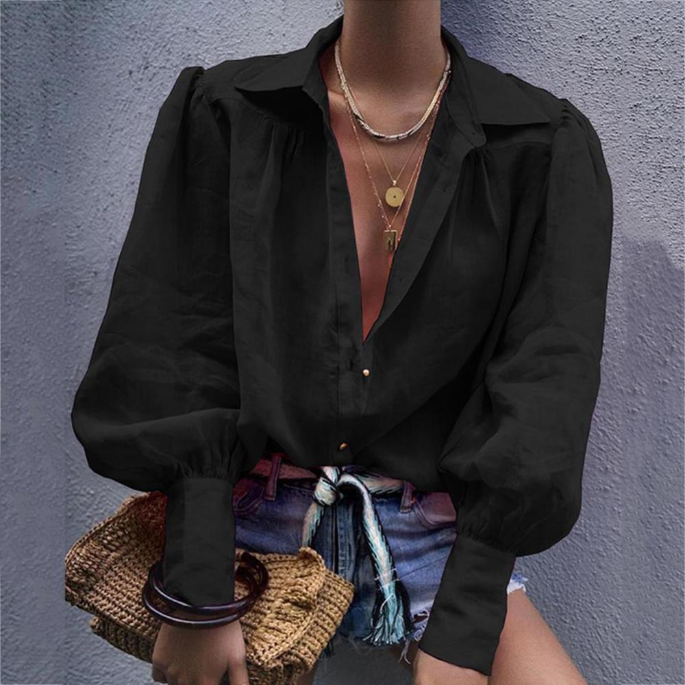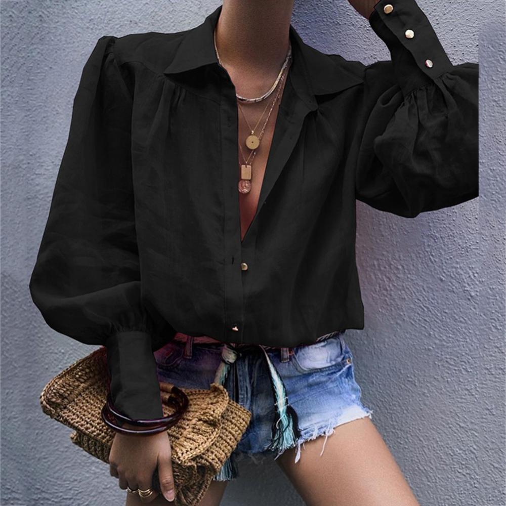 Женская рубашка на пуговицах с пышными рукавами, свободная блузка с отложным воротником, однотонная Повседневная офисная модная блузка в стиле OL, женская рубашка6,48-9,50 долларов США/штука