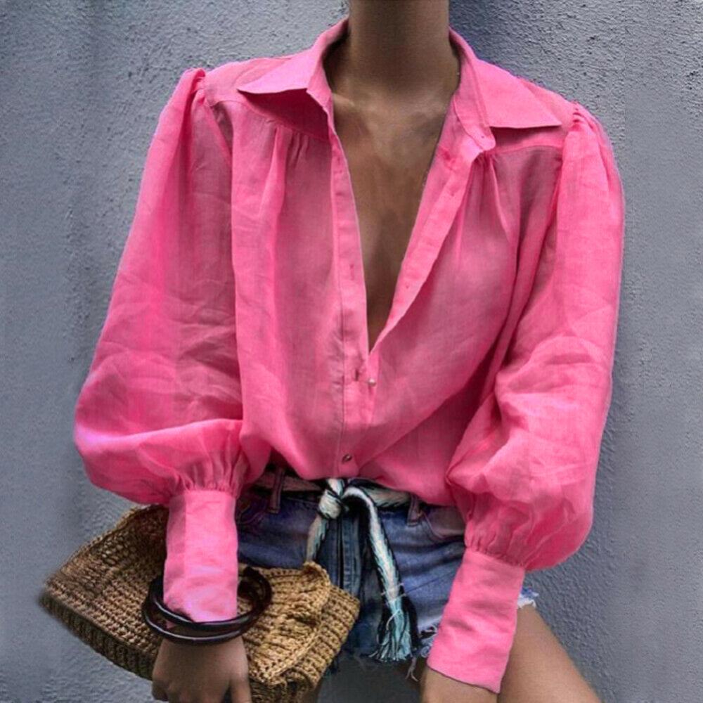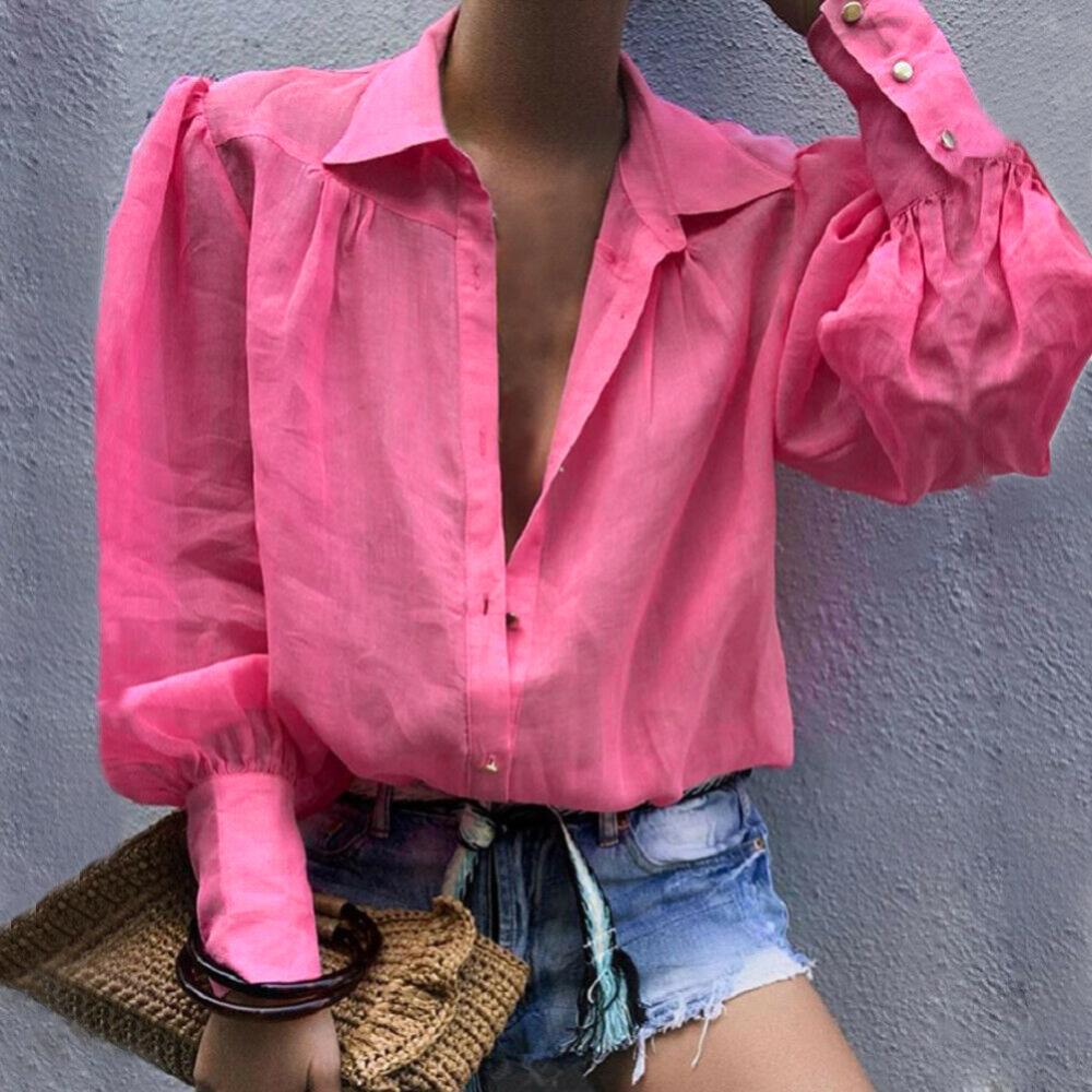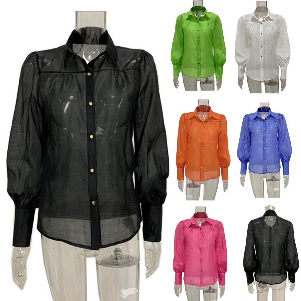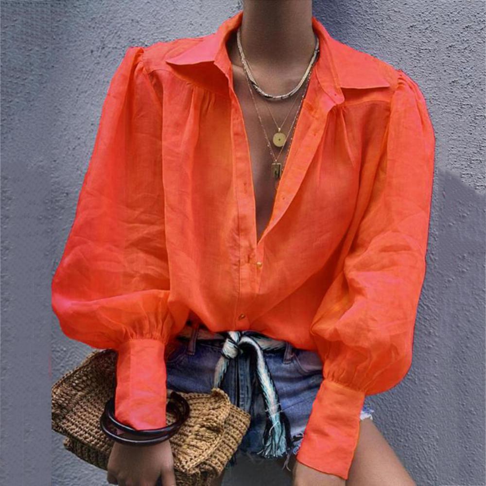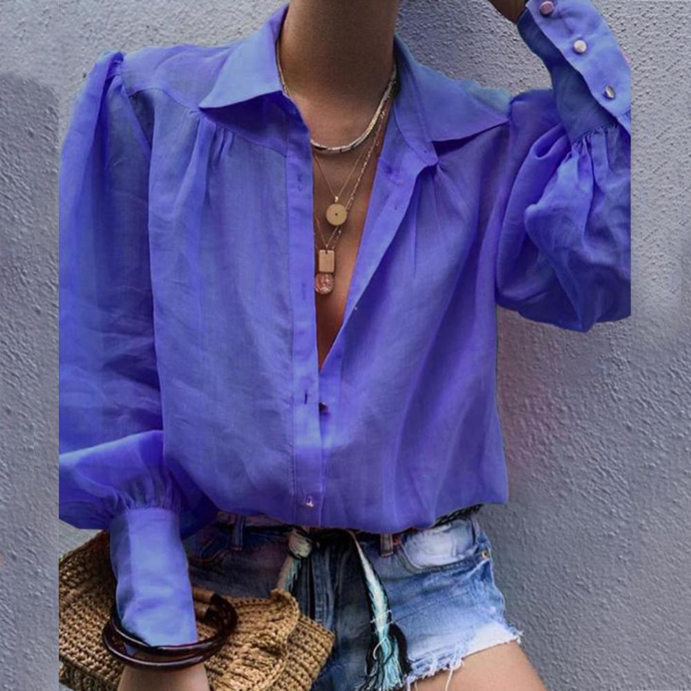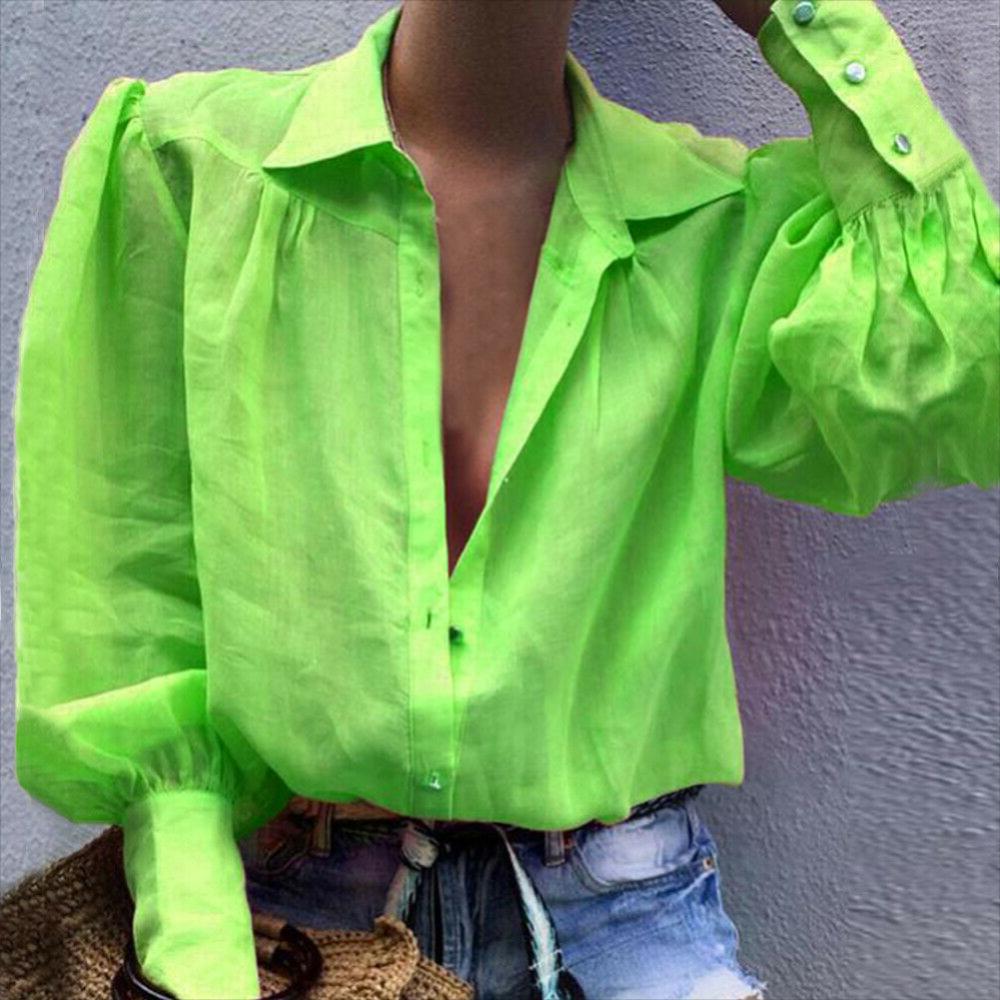 Женская рубашка на пуговицах с пышными рукавами, свободная блузка с отложным воротником, однотонная Повседневная офисная модная блузка в стиле OL, женская рубашка6,48-9,50 долларов США/штука