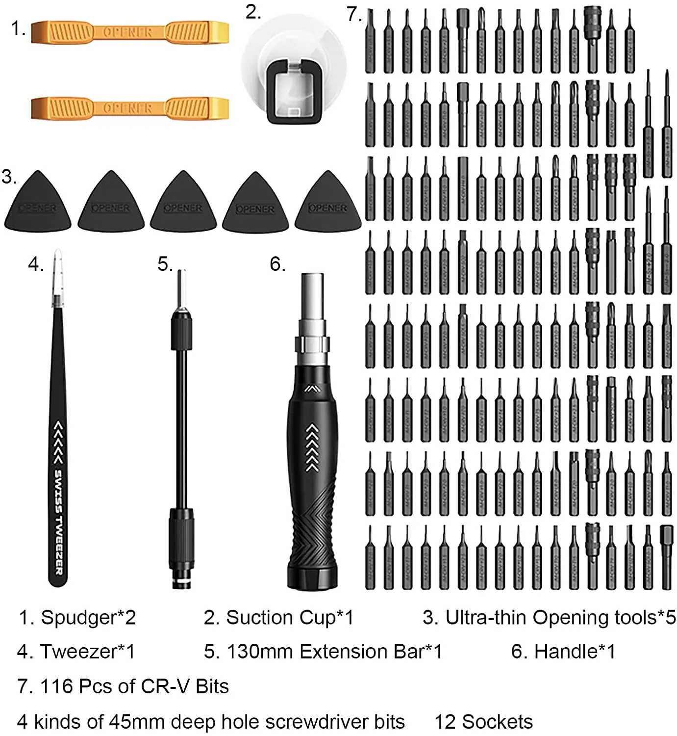 1 ручка, 2 ручки для ботинок, пленка для ботинок: 5, пинцет: 1, Удлинительный стержень: 1, присоска: 1, встроенный намагничиватель, встроенный ящик для деталей.