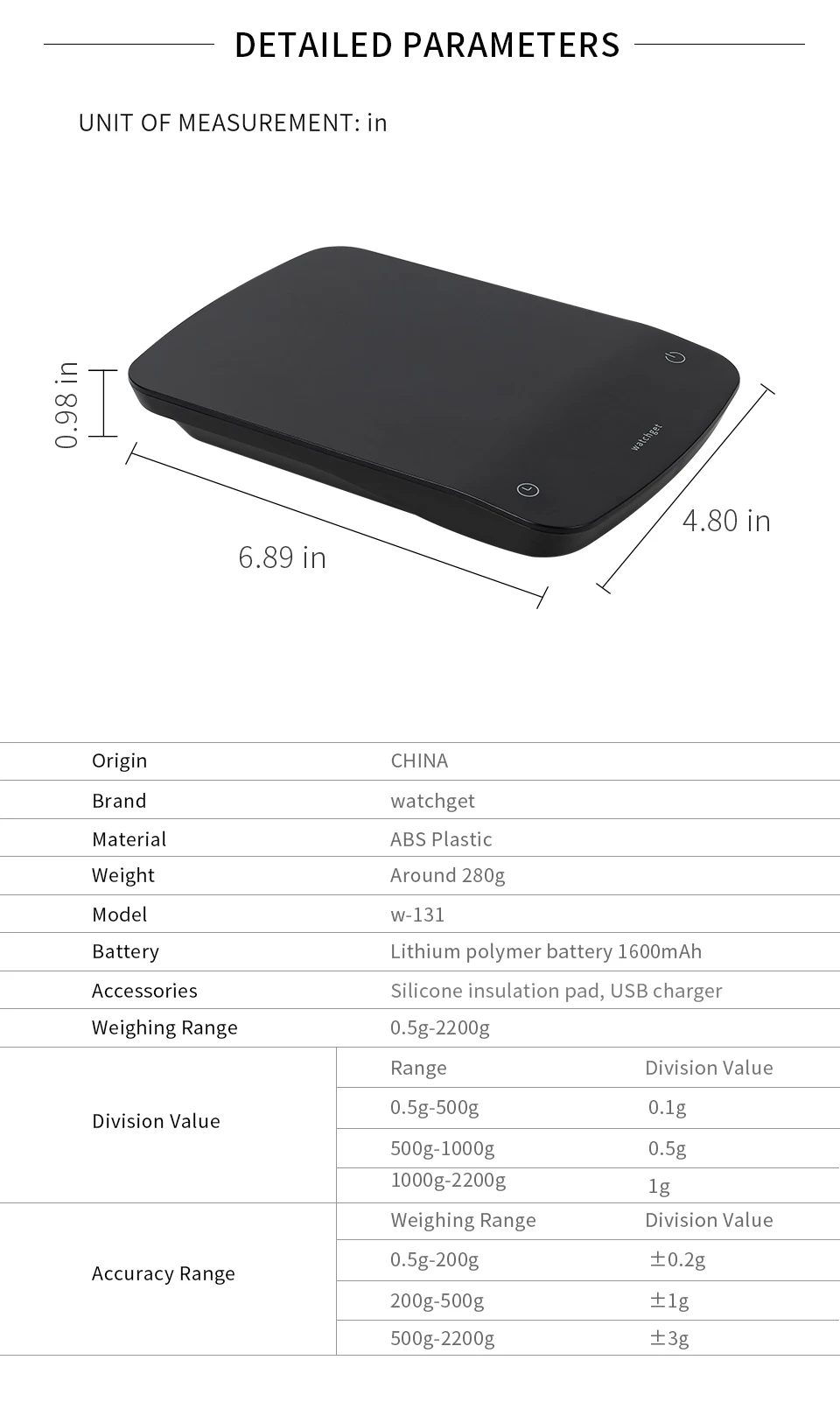 🌟 The measuring precision of the scale is ±0.2g within a range of 0.5g-200g, ±1g within a range of 200g-500g, ±3g within a range of 500g-2200g. The initial minimum weight is 0.5g, the maximum load weight is 2200g.