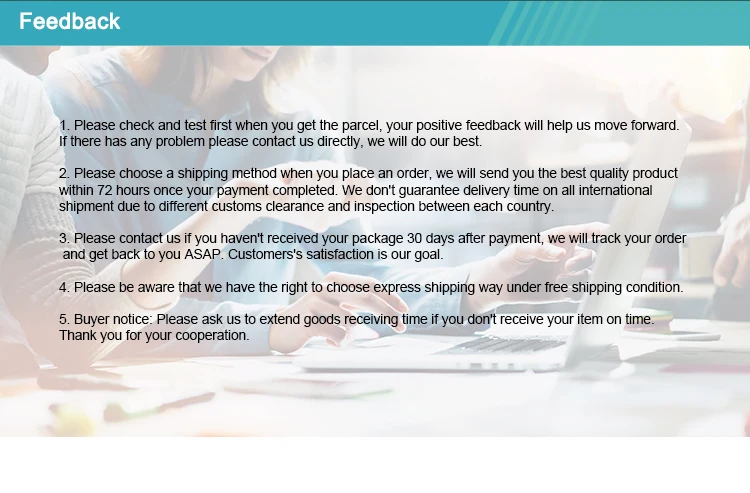 2. Но, пожалуйста, не волнуйтесь, если ваша посылка не очищает таможню и в итоге возвращается таможней, пожалуйста, сначала свяжитесь со службой поддержки клиентов, и мы организуем возврат денег вам как можно скорее после проверки статуса заказа и посылка. Ваши деньги не будут потеряны! Вообще говоря, ваш платежный счет получит возврат средств с платформы или от нас в течение 3-20 дней после официальной обработки. Мы приносим извинения за неудобства.