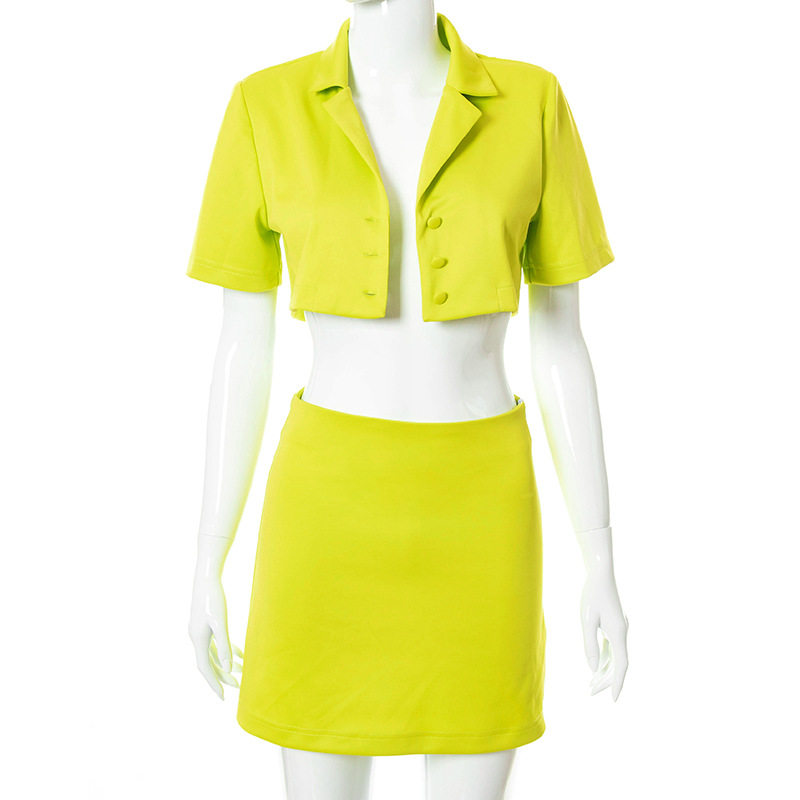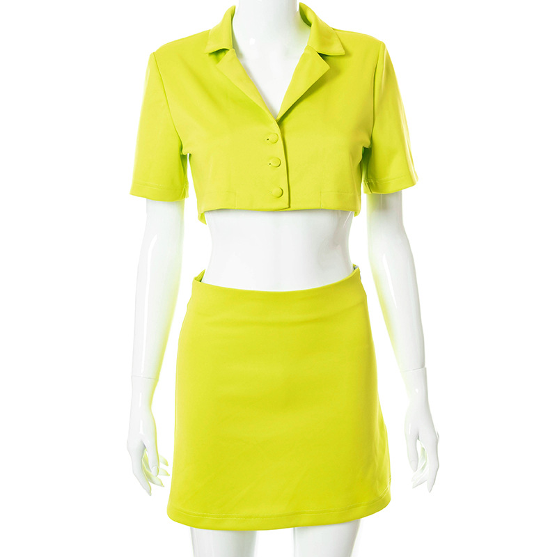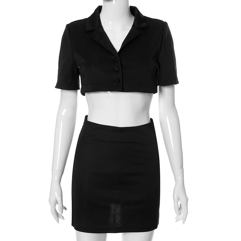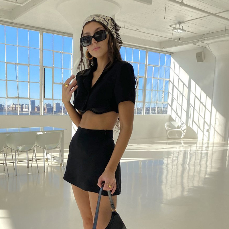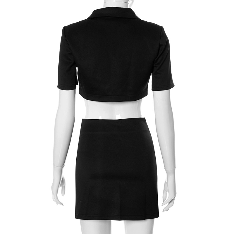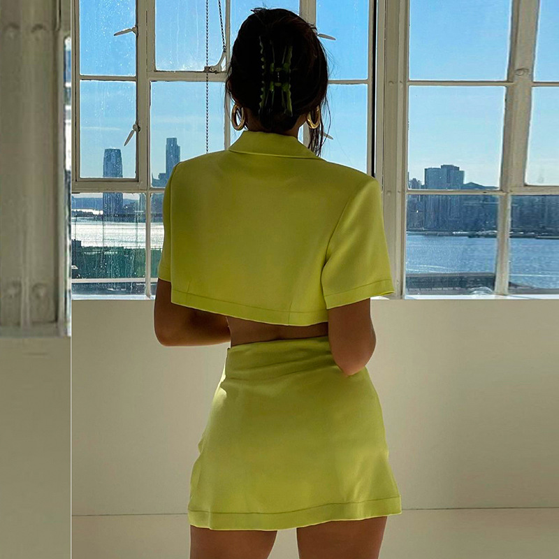 Женский летний комплект из 2 предметов, однотонный топ с отворотом и коротким рукавом, Открытый Топ на пуговицах + юбка с высокой талией
