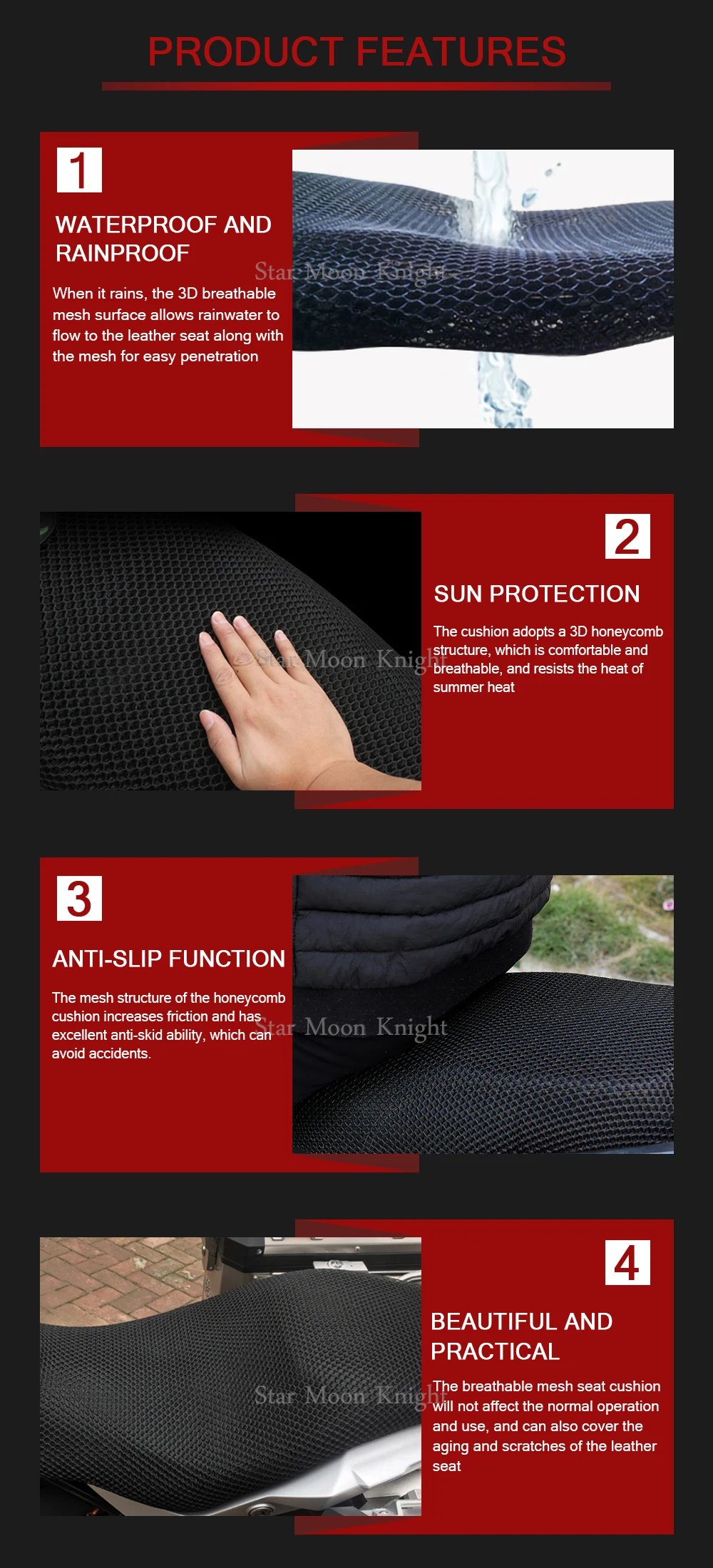 Этот чехол для сиденья-это кондиционер для вашего оригинального сиденья мотоцикла. Воздух может циркулировать во время вождения, потому что крышка трехмерная. Даже при большом весе, он не может быть полностью сжатым: это не только обеспечивает воздухопроницаемость, но и сохраняет ваши ягодицы сухими, когда идет дождь. Крутой чехол не нагревается даже при прямых солнечных лучах. Еще один плюс: это создает массажный эффект и тем самым уменьшает признаки усталости.