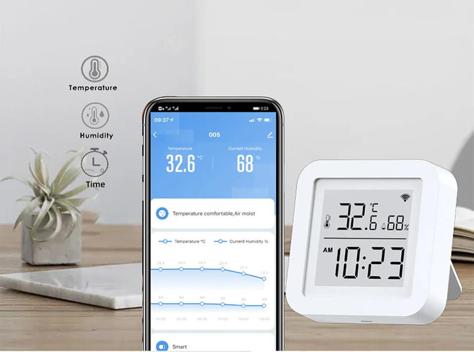 Высокоточный и мониторинг в реальном времени поможет вам завершить различные стратегии связи. Например, если температура достигает 32,6 градусов Цельсия, чем включить кондиционер через наш универсальный пульт дистанционного управления. Или включите увлажнитель воздуха, когда влажность меньше определенного значения.
