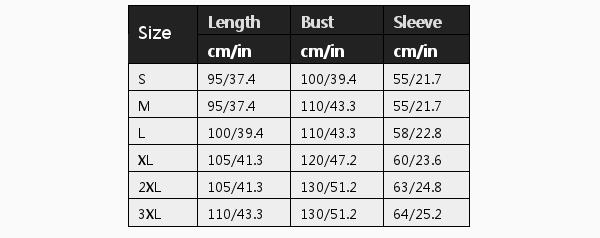 Размер: | 3XL | Длина (см/дюйм): | 110/43.3 | Бюст (см/дюйм): | 130/51.2 | Рукав (см/дюйм): | 64/25.2 |