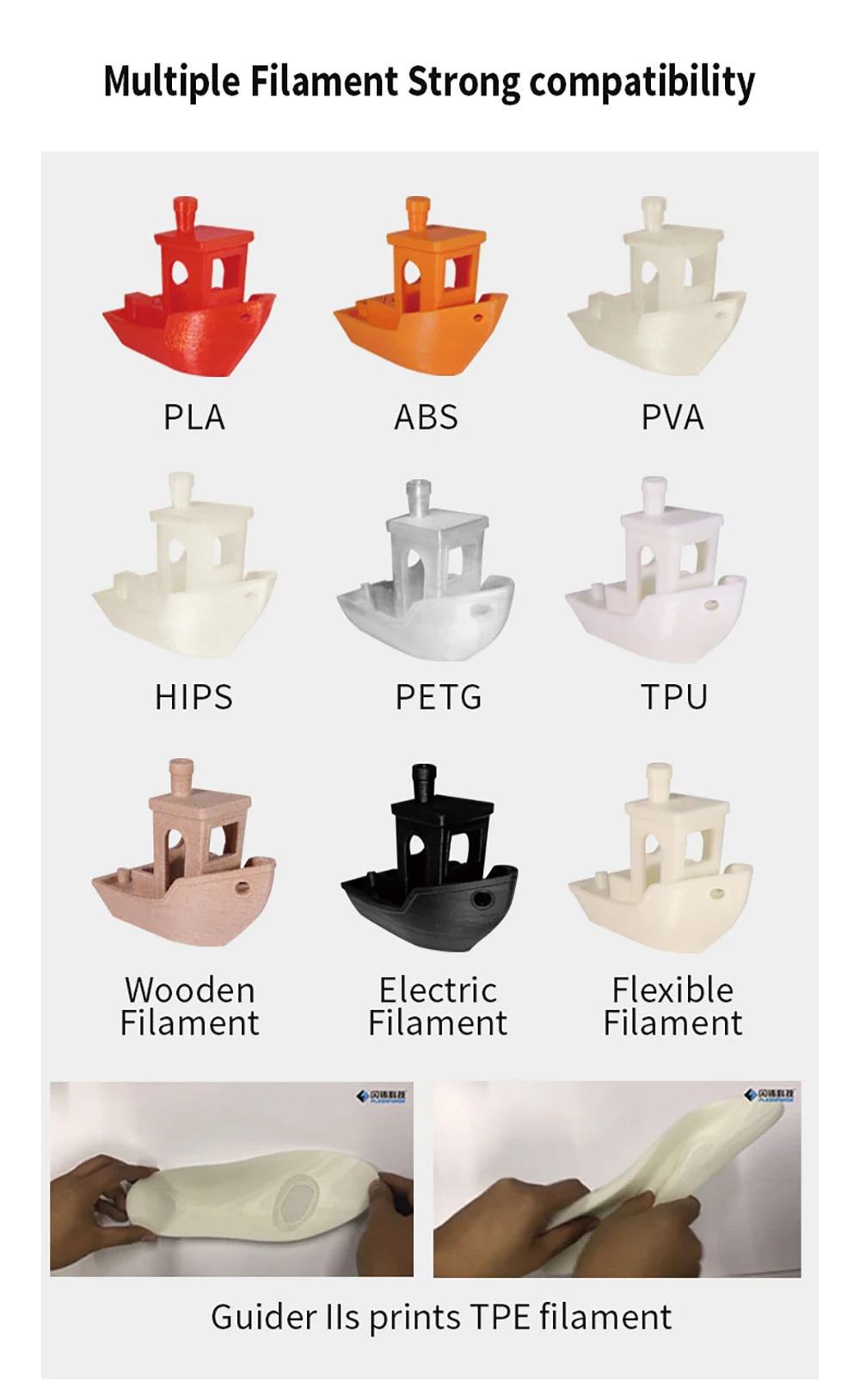 Название: Guider IISКоличество экструдера: 1Технология печати: Плавленая нить (FFF)Размер экрана: 5 дюймов цветной сенсорный экран IPSОбъем сборки: 280*250*300 ммСлои Разрешение: 0,05-0,4 ммСборка Точность: ± 0,2 ммТочность позиционирования: ось Z 0,0025 мм; Ось XY 0,011 ммНити Диаметр: 1,75 мм (± 0,07)Сопло Диаметр: 0,4 ммСкорость печати: 10 ~ 200 мм/сек.Программное обеспечение: FlashPrint/Поддержка Simplify3DПоддерживаемые форматы: Вход: 3MF/ STL/OBJ/FPP/BMP/PNG/JPG/JPEGПромышленный большой размер