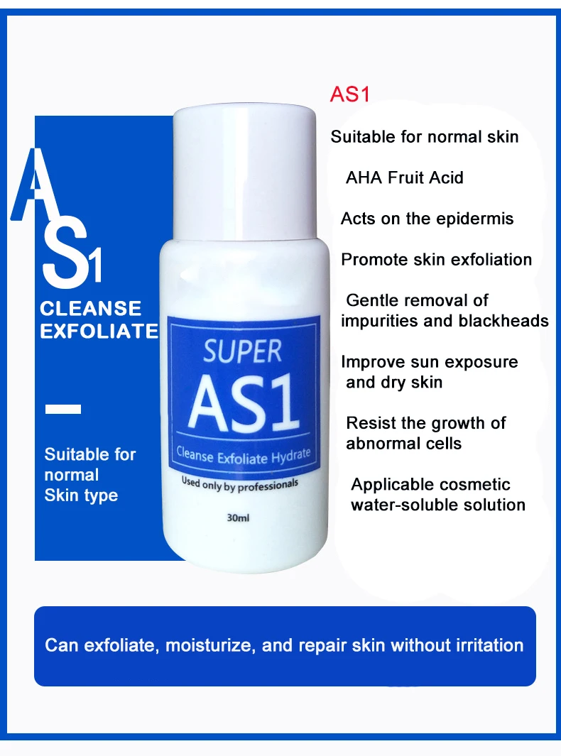 AS1: нормальная кожа, слабая кислота может способствовать шелушению кожи, мягко удаляет примеси, удаляет кожное сало из кератиноза и длительное увлажнение.