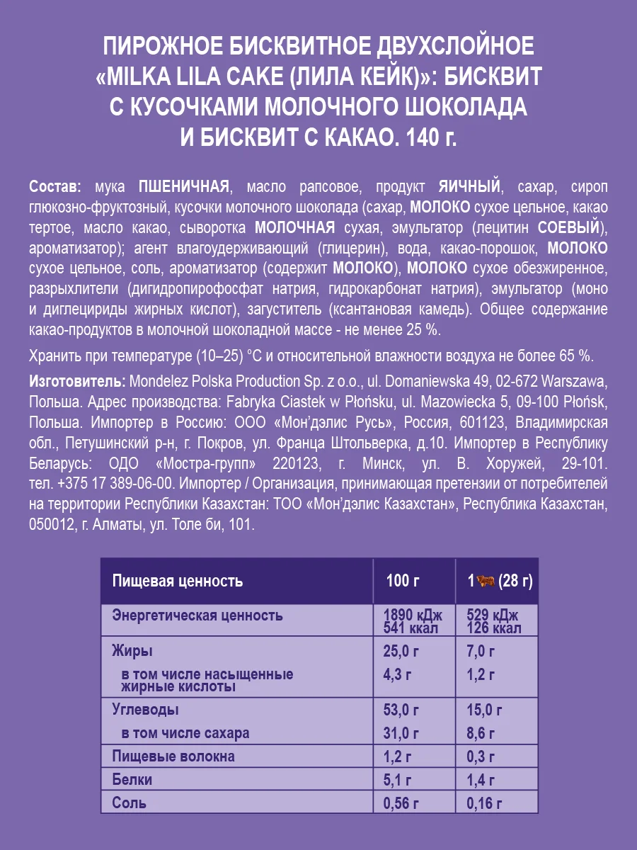Пшеничная мука, масло рапса, продукт яйца, сахарный сироп глюкозно-фруктозный, кусочки молочного шоколада (сахар, сухое молоко, какао-тертое, какао-масло, сывороточное молоко сухое, эмульгатор (лецитин, соя), ароматизатор); Влагоудерживающий агент (глицерин), вода, какао-порошок, молочный порошок (Содержит молоко), Сухое молоко ским, разрыхлители (натрий, гигрокарбоновый натрий), эмульгатор (моно и диглецириды жирных кислот), загуститель (ксантановая камедь).