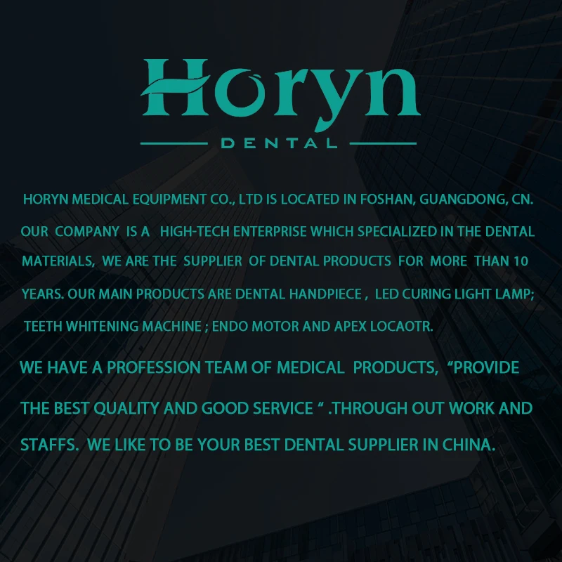 Horyn медицинское оборудование co., Ограниченное количество находится в Фошань, Гуандун, Китай. Horyn Dental medical company-высокотехнологичное предприятие, специализирующееся на стоматологических материалах, Мы являемся поставщиком стоматологических продуктов более 8 лет. Наши основные продукты-стоматологические наконечники. Светодиодный светильник для отверждения. Индукционная лампа, микромотор портативный блок, лубрикатор, Apex локатор и другое стоматологическое оборудование и аксессуары.