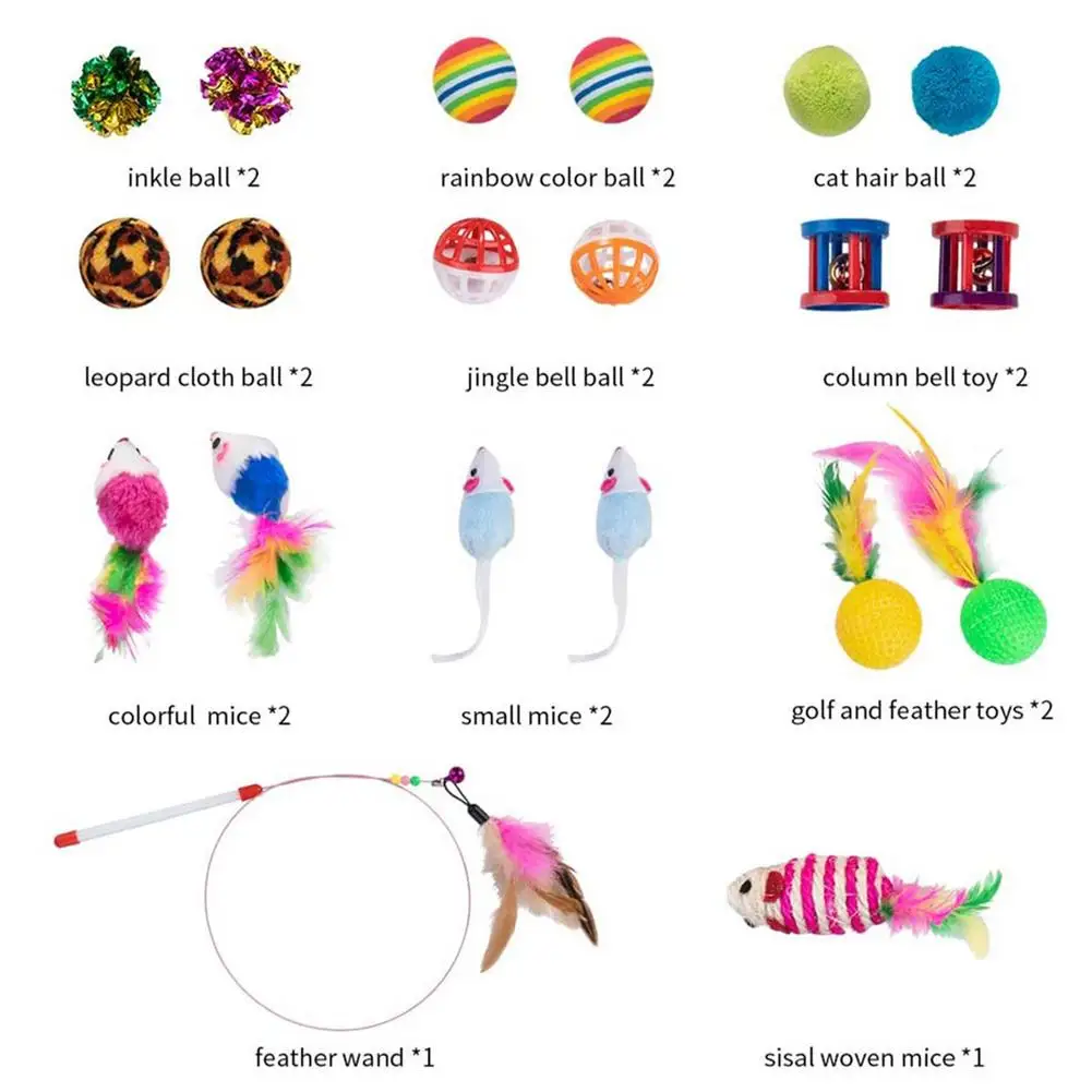 4. Комбинация из 21 предмета: включает в себя Трехходовой туннель * 1, Леопардовый узор * 2, колокольчик * 2, Радужный шар * 2, меховой шар * 2, Цветочный барабан * 2, бумажный шар * 2, мяч для гольфа * 2, плюшевая мышь * 2, цветная мышь * 2, цветная палочка для забавных кошек * 1, мышь для сизаля * 1.