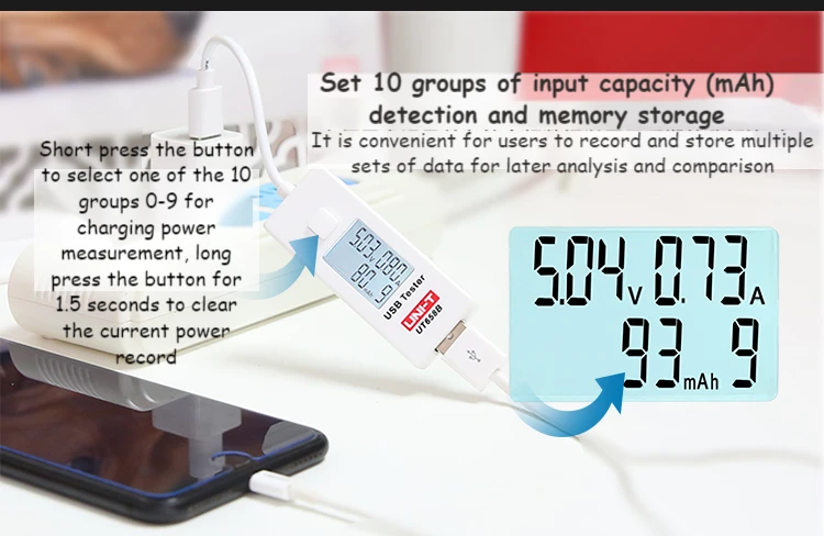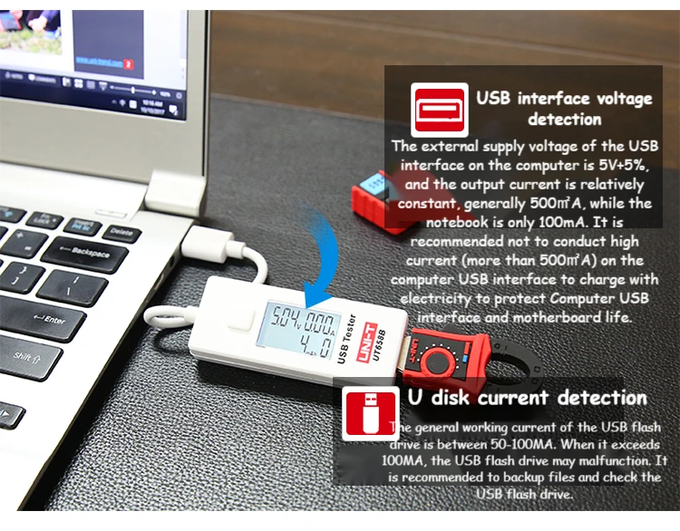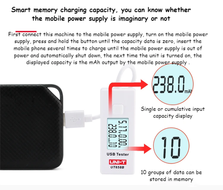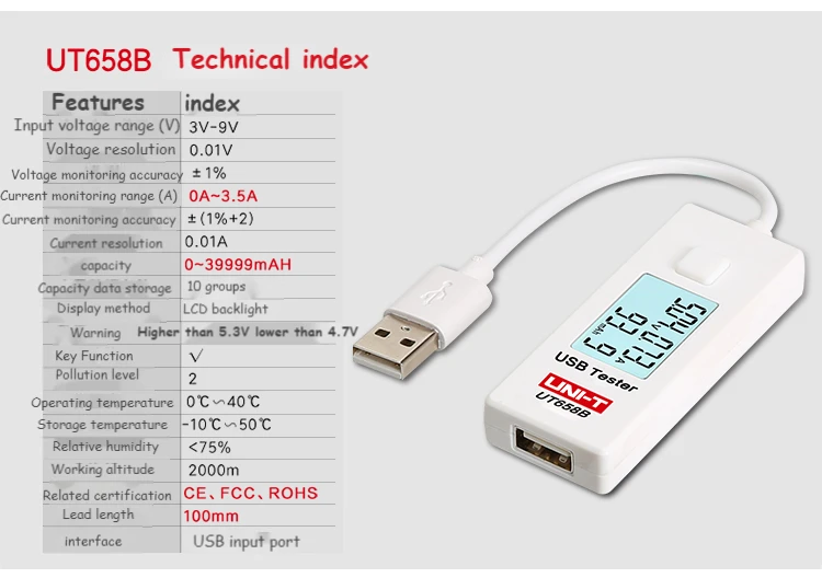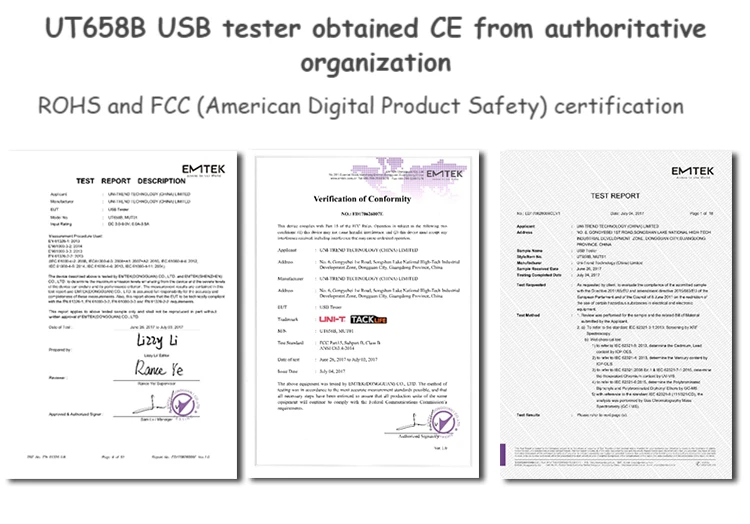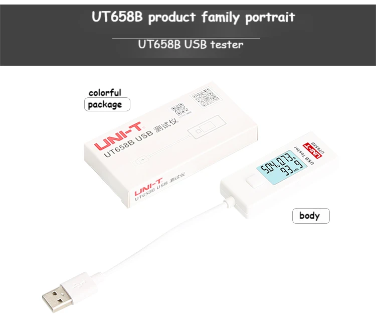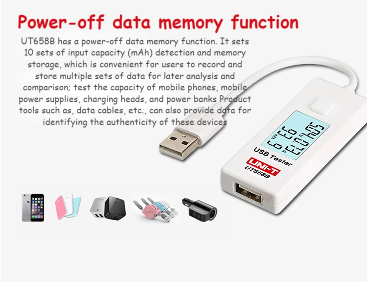 На второе поколение UT658 серии тестеры USB может проверить USB зарядные устройства, портативные Хранители заряда источников, кабели для передачи данных, и других электронных устройств зарядных устройств.
