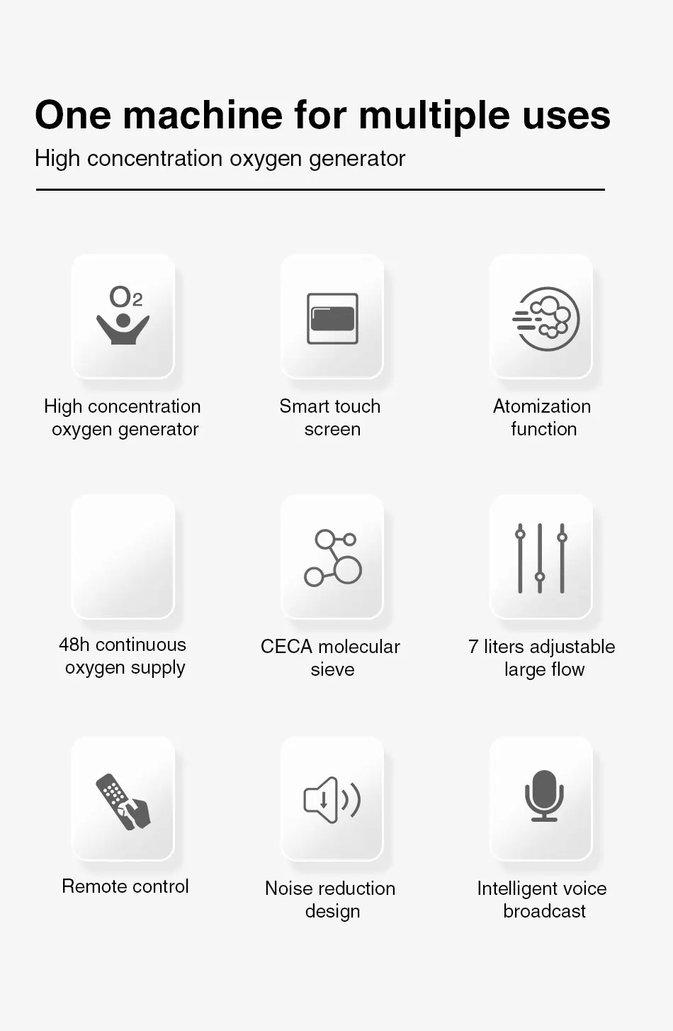 【Портативный и легкий вес 】: генератор кислорода весит только 6,2 кг, и он широко используется в домашних условиях, различных клиниках, семейных врачах и т. Д. Примечание: Эта машина используется для семейного ухода за здоровьем, не используется для тяжелых заболеваний Описание продукта этот продукт использует принцип адсорбции изменения давления. В качестве сырья используется воздух. Цеолитовые молекулярные сита используются в качестве адсорбентов для отделения кислорода в воздухе от других газов, таких как азот. При нормальной температуре и давлении высокая концентрация кислорода может непрерывно отделяться от воздуха при включении питания.