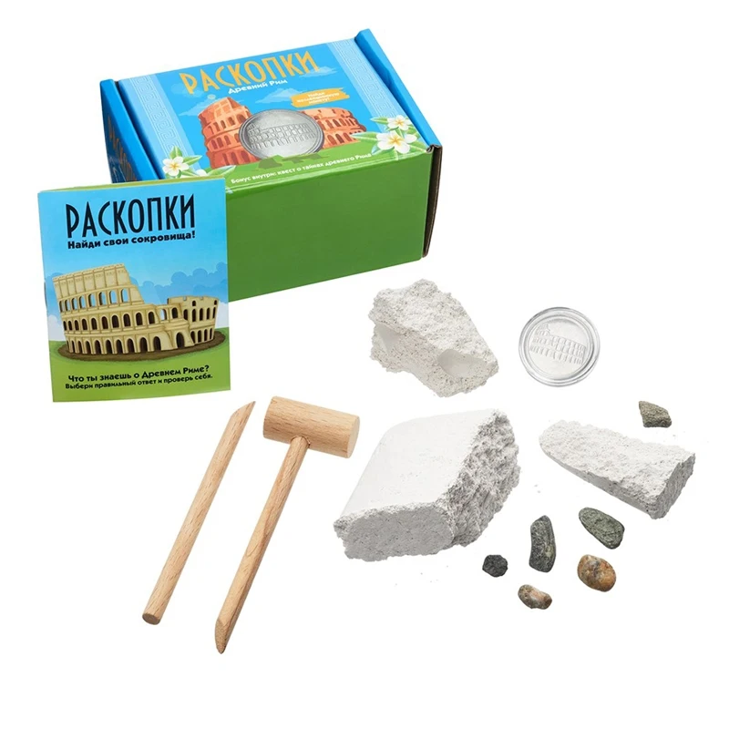 В наборе: брусок с артефактами внутри (россыпь природных камней, сувенирная монета из металла в коллекционном чехле из пластика), деревянный стек, деревянный молоточек, тематический буклет с викториной.