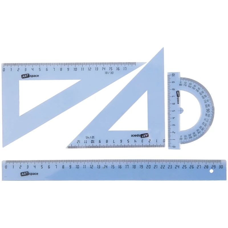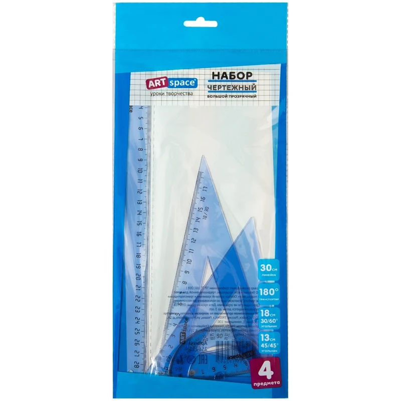 Набор чертежный большой тонированный полупрозрачный ( Линейка пластиковая 30 cм, треугольник пластиковый 30°,60 °, 18 см, треугольник пластиковый 45°,45 °, 13 см, линейка-транспортир пластиковая 180 ° ) . Упакован набор в пакет с европодвесом.