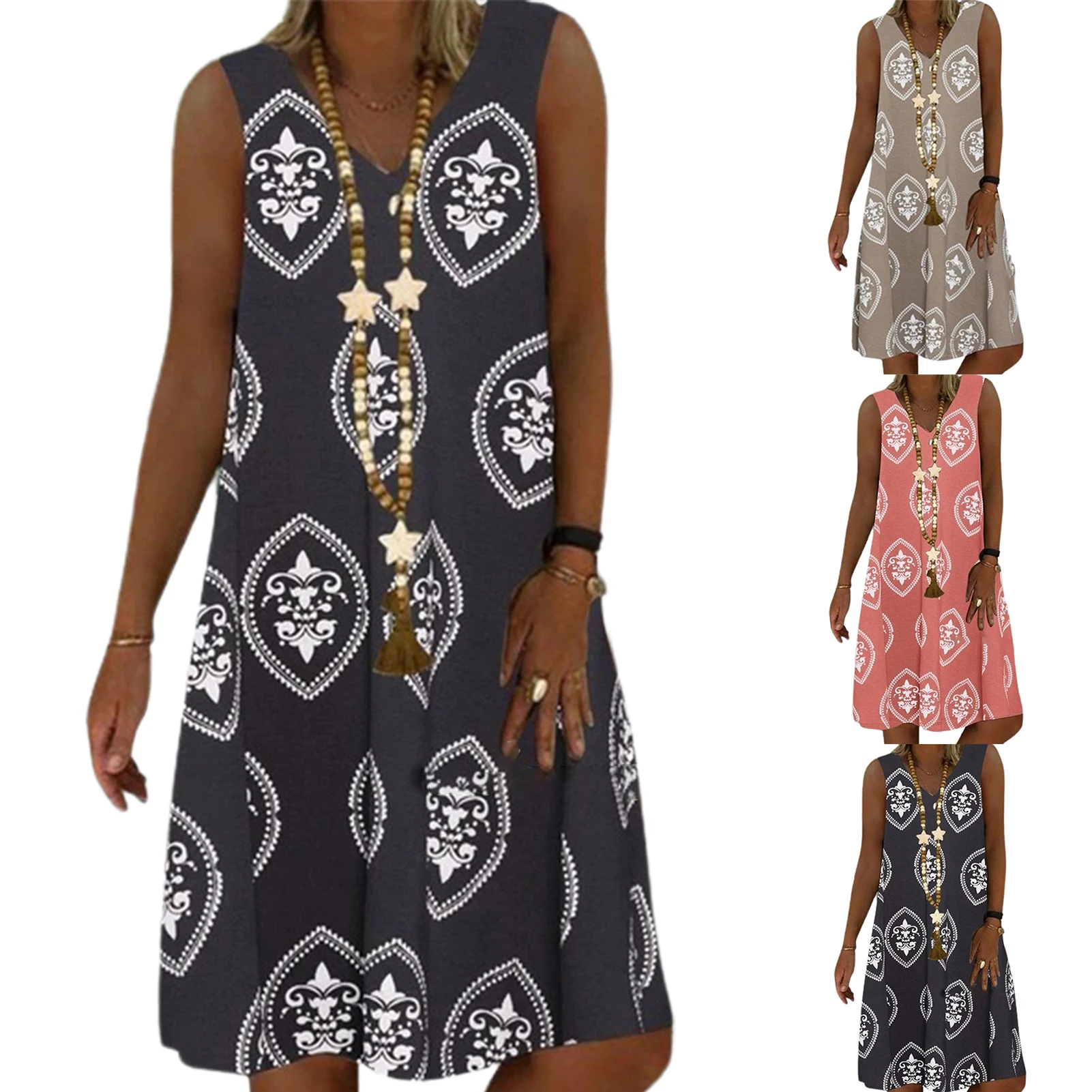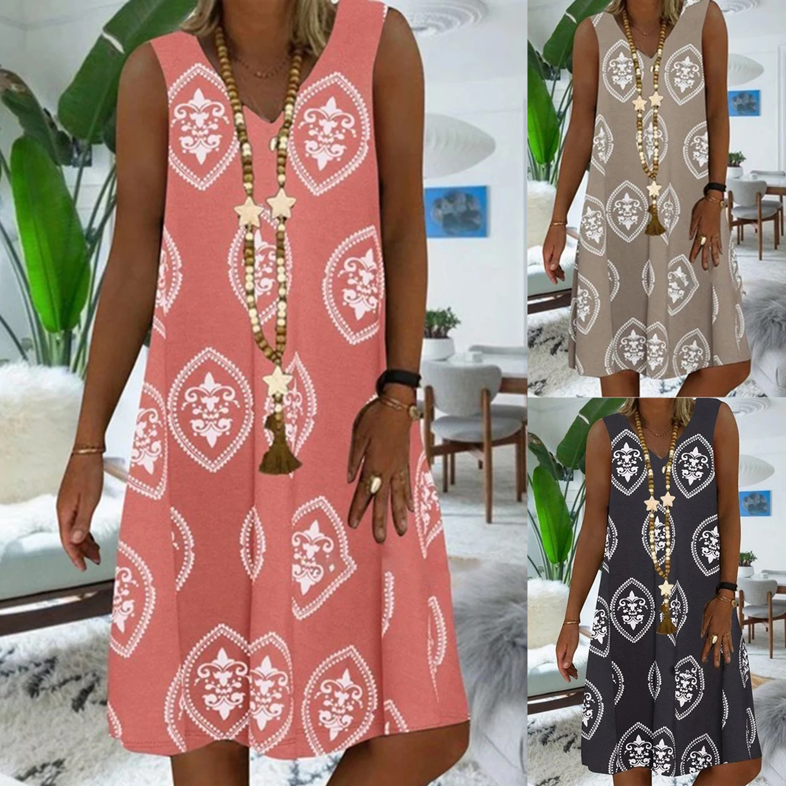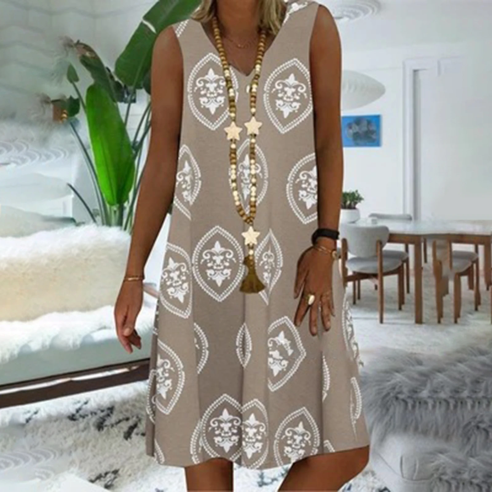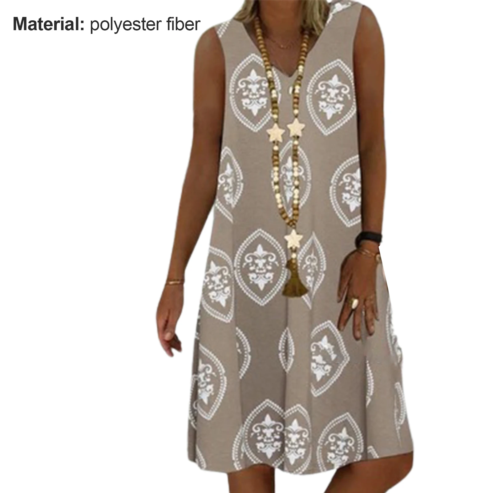 Дизайн с v-образным вырезом позволяет украсить шею ожерельем. Рисунок придает этому платью чувство дизайна и моды.