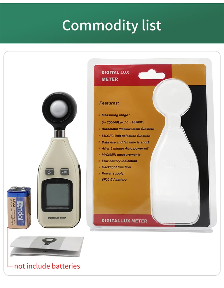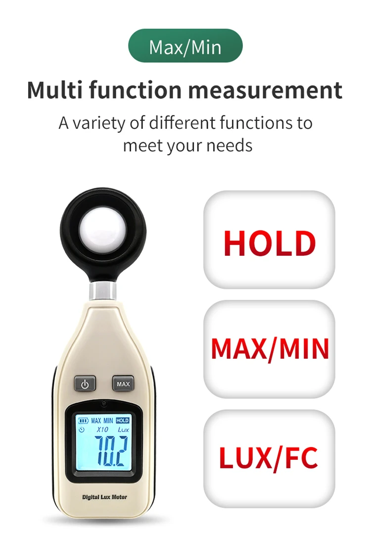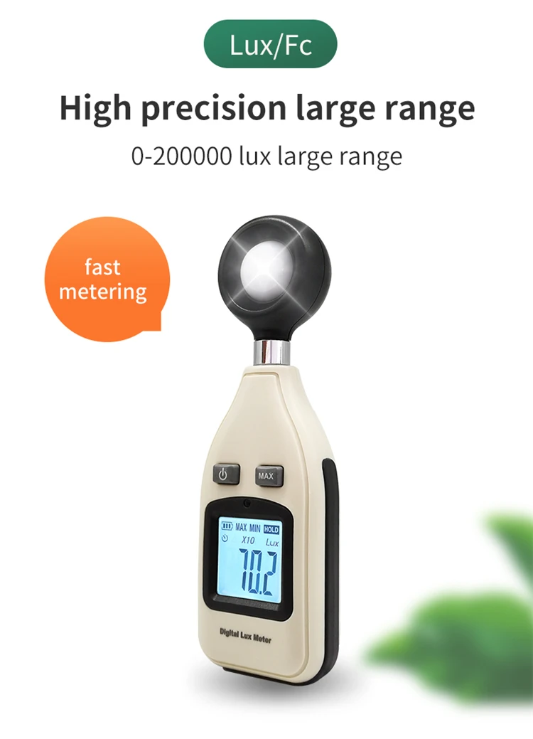 1. Диапазон измерения: 0Lux ~ 200,000Lux; 0Fc ~ 185,806Fc