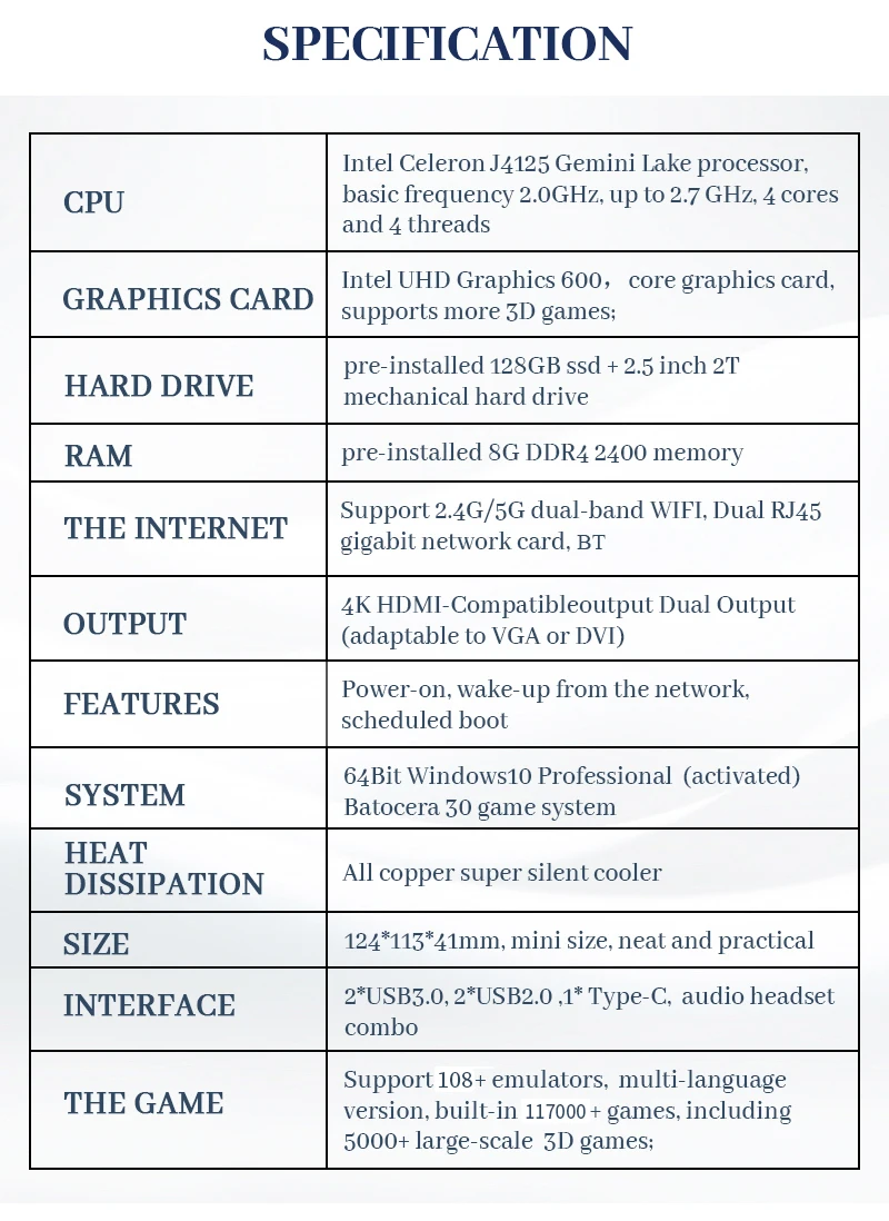 Предварительно установленный Windows 10 PRO, богатая Экология программного обеспечения, офис эффективный офис. Новейшая игровая система Batocera 30, встроенная в игры 71000 +, может поддерживать более масштабные игры, улучшать игровой опыт.