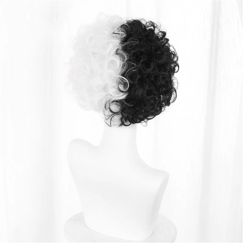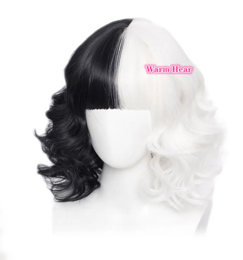 Аниме Круэлла де вил короткий крули половина черный и половина белый парик для косплея Жаростойкие синтетические волосы Хэллоуин волос + парик