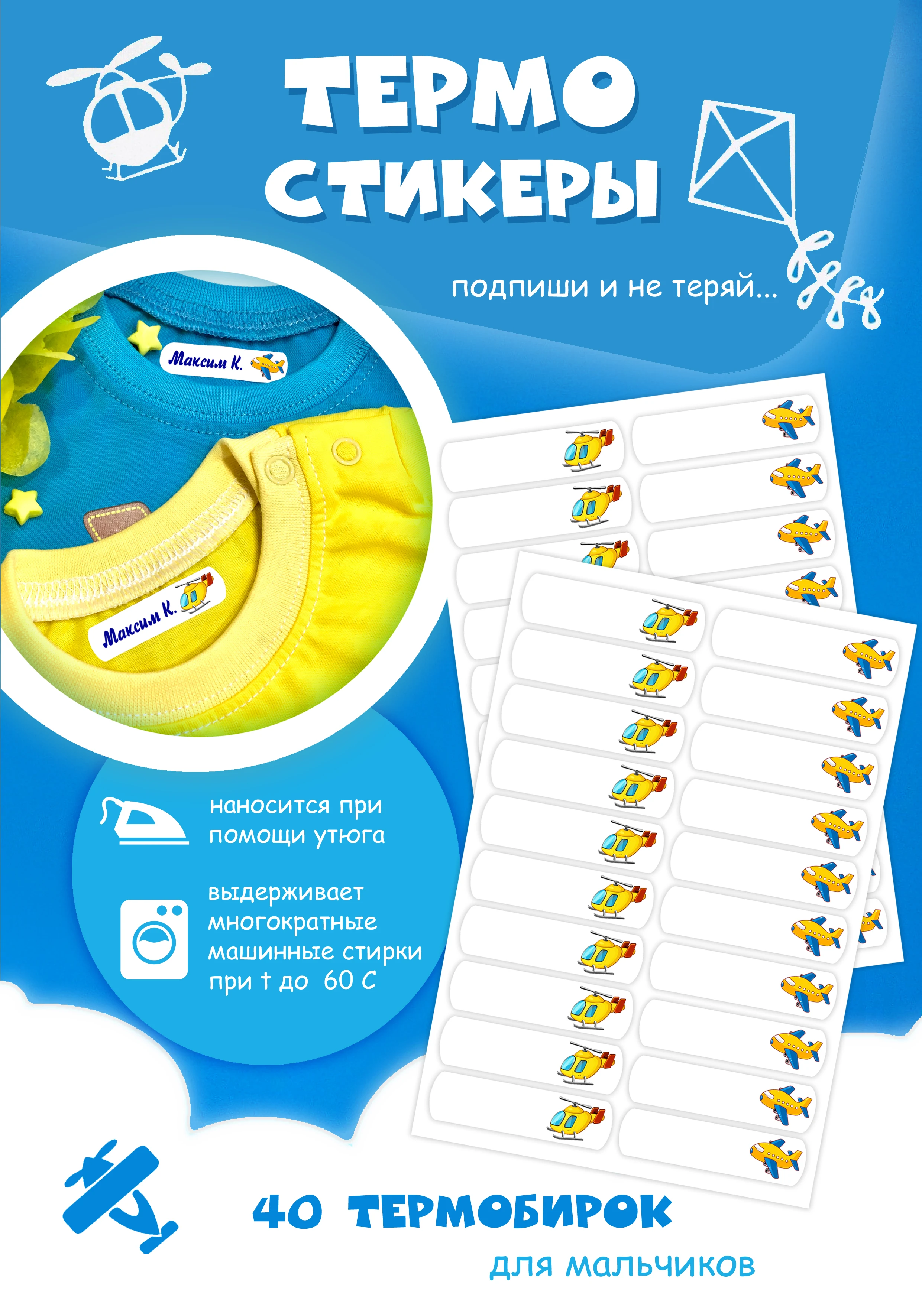 Собираетесь или уже ходите в детский сад, школу, спортивную секцию или едете в лагерь?С помощью термостикеров вы быстро и без труда промаркируете всё необходимое.Стикеры НАНОСЯТСЯ при помощи обычного бытового УТЮГА, надежно фиксируются на одежде, при этом остаются неощутимыми для кожи.При правильном нанесении выдерживают многократные машинные стирки при температуре не выше 60 градусовС термостикерами вы в разы снижаете риски обмена или потери своих вещей.Для производства стикеров мы используем самые качественные и проверенные годами материалы!