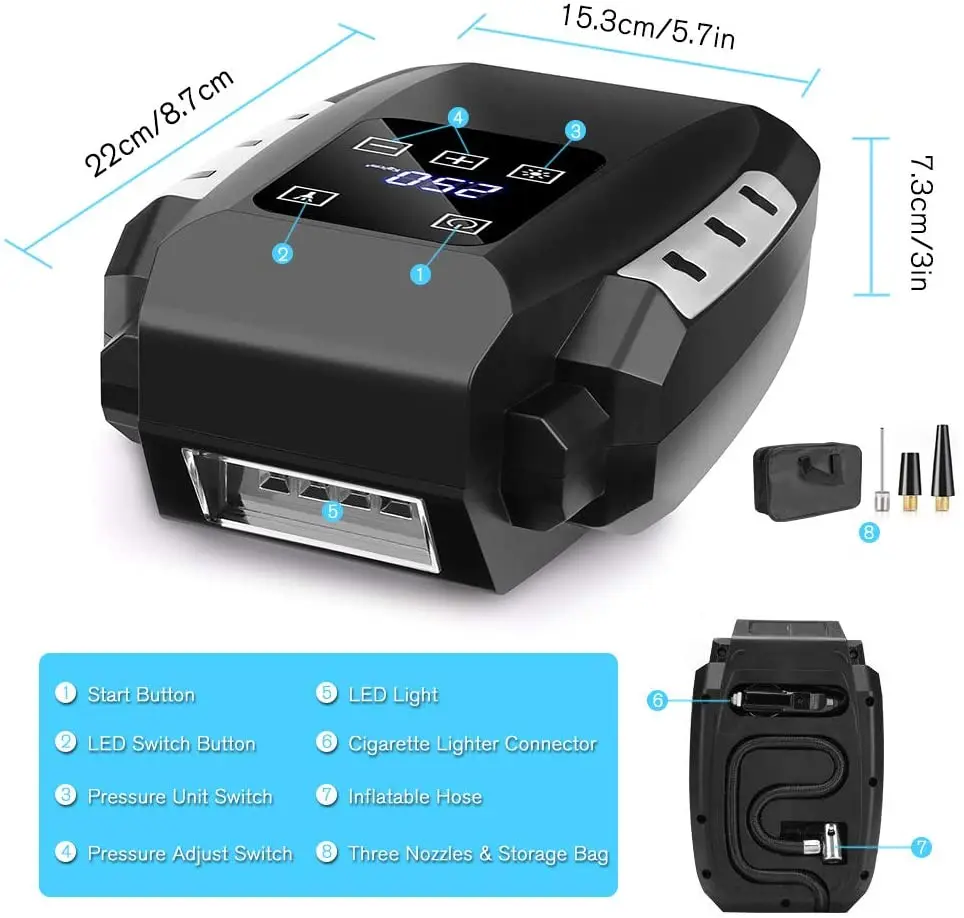 Автомобильный шиномонтажный насос с кабелем длиной 9,3 feets может легко достигать четырех шин, 3 различных сопла могут удовлетворить различные потребности в надувании. Например, автомобиль, велосипед, мотор, мяч, воздушная подушка, внедорожник среднего размера и т. Д. Сзади есть отделения для хранения кабеля питания и надувной линии, черная сумка-тоут на молнии для удобной переноски и хранения.