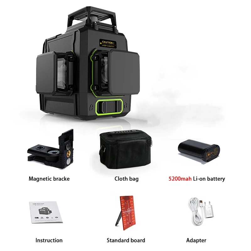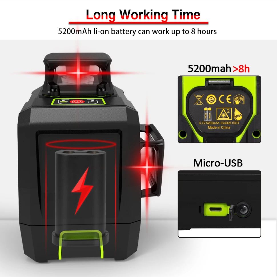 Литий-ионная батарея 5200 мАч, состоящая из батарей 18650, может быть изменена в необходимое время. Поместите литиевый аккумулятор в отсек батареи, затем литиевая батарея может быть заряжена. Адаптер также может заряжать линейный лазерный уровень отдельно.