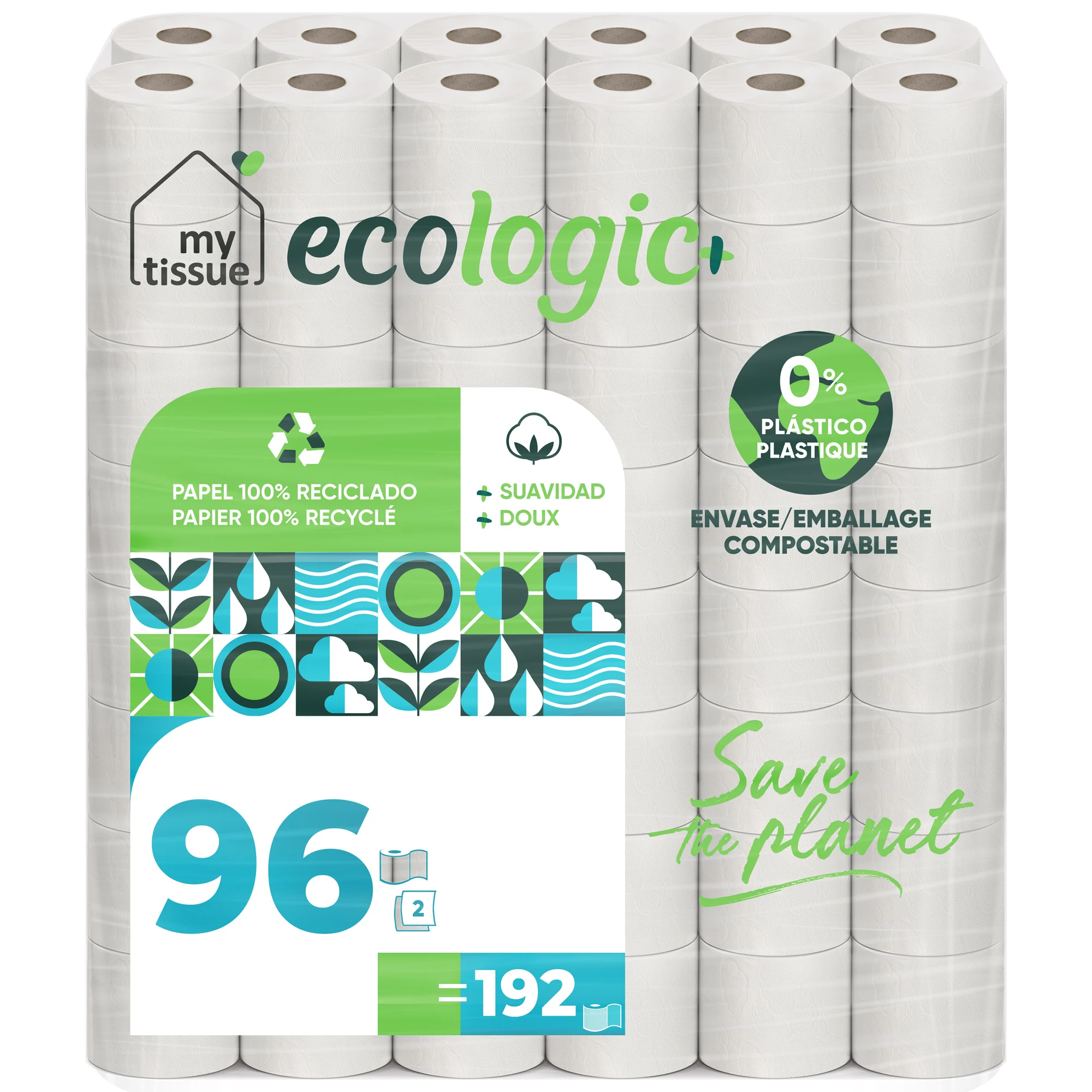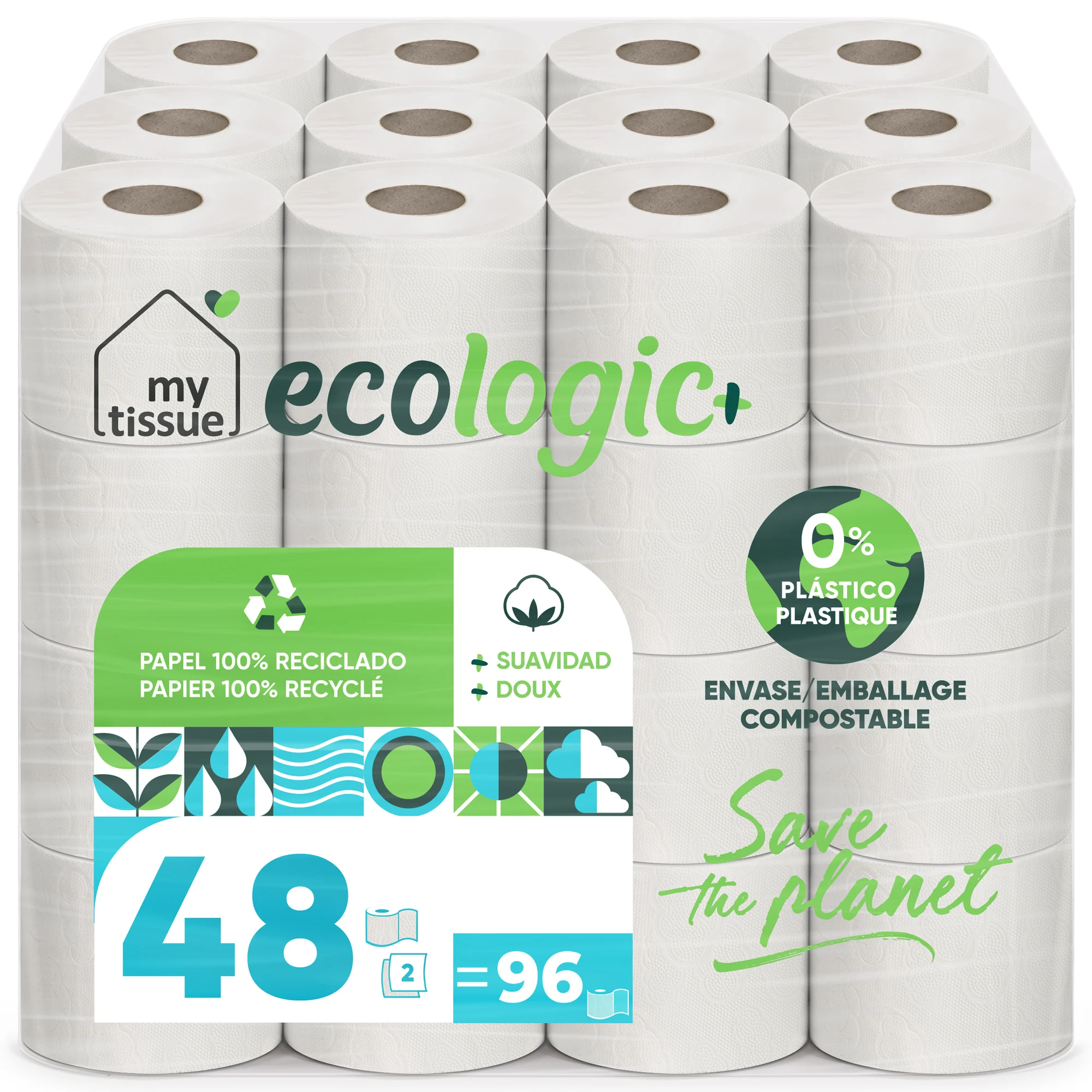 My Tissue Ecologic + household toilet paper, 100% recycled cellulose: 48 rolls 36 m. c/u; 1728 meters total toilet paper